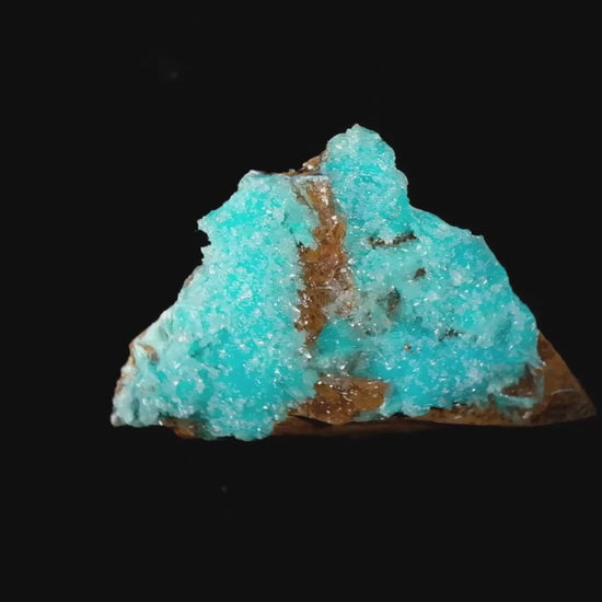 Lustrous and sparkling turquoise-blue acicular sprays of aurichalcite completely covered by water-clear gemmy crystals of hemimorphite, on a matrix of goethite-stained host rock. This aurichalcite occurrence is quite obscure, with only one image in the public archives of Mindat.