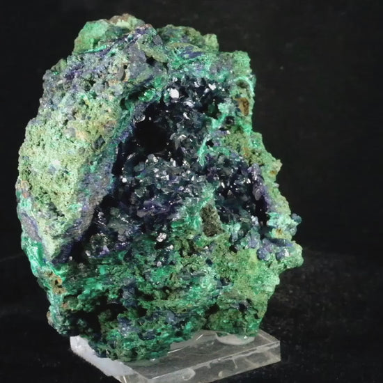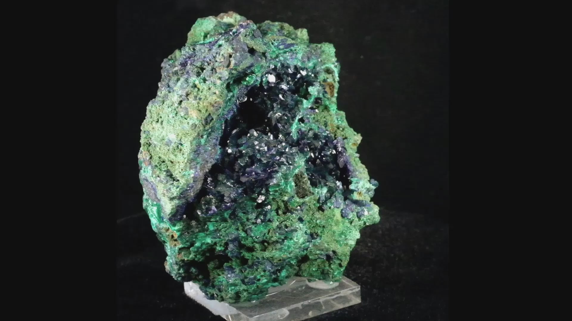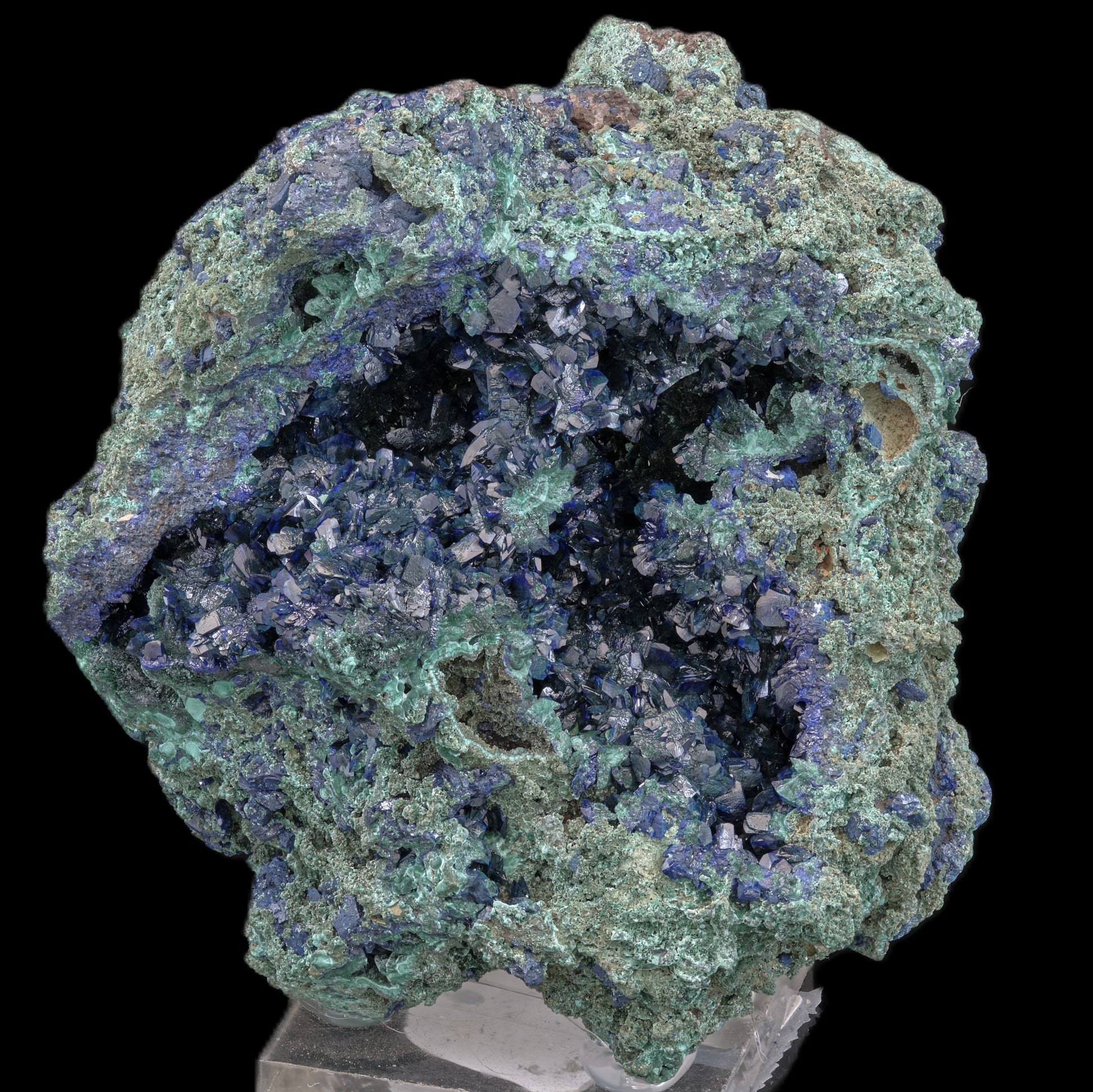 An eye-catching, sizable cabinet piece showcasing lustrous, teal-to electric-blue azurite crystals with accents of banded to acicular, Kelly-green malachite. The crystals really pop in direct lighting, with true, some presenting electric blue translucency. High-resolution macrophotography reveals partial pseudomorphosis to gemmy malachite. The form and color associations of this cabinet piece are, frankly, superb. The subject of a professional paper in 1991*, the Liufengshan deposit is an unusual leaching-accumulation type copper-iron deposit, hosted in Quaternary gravels that are deposited in erosion caves of Carboniferous limestones. The crystallization is reminiscent of the famous La Sal azurite locality in Utah. According to write-ups in Mindat, this locality is said to have been closed. Self-standing, mounted on a clear acrylic base.