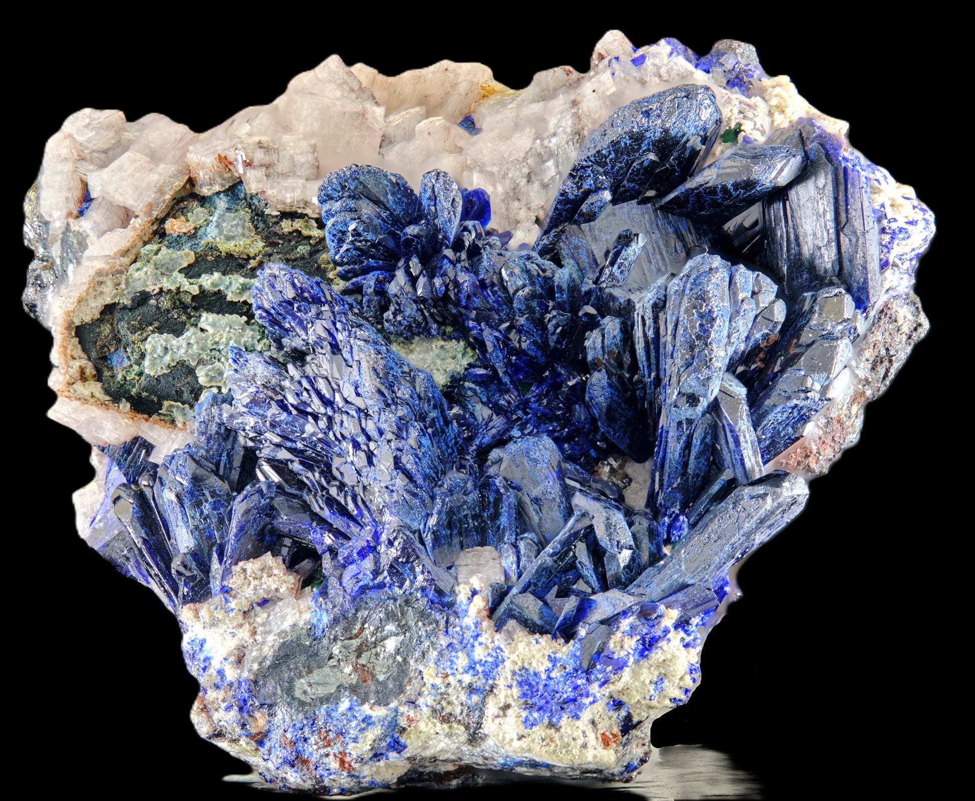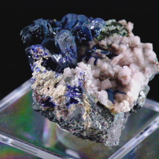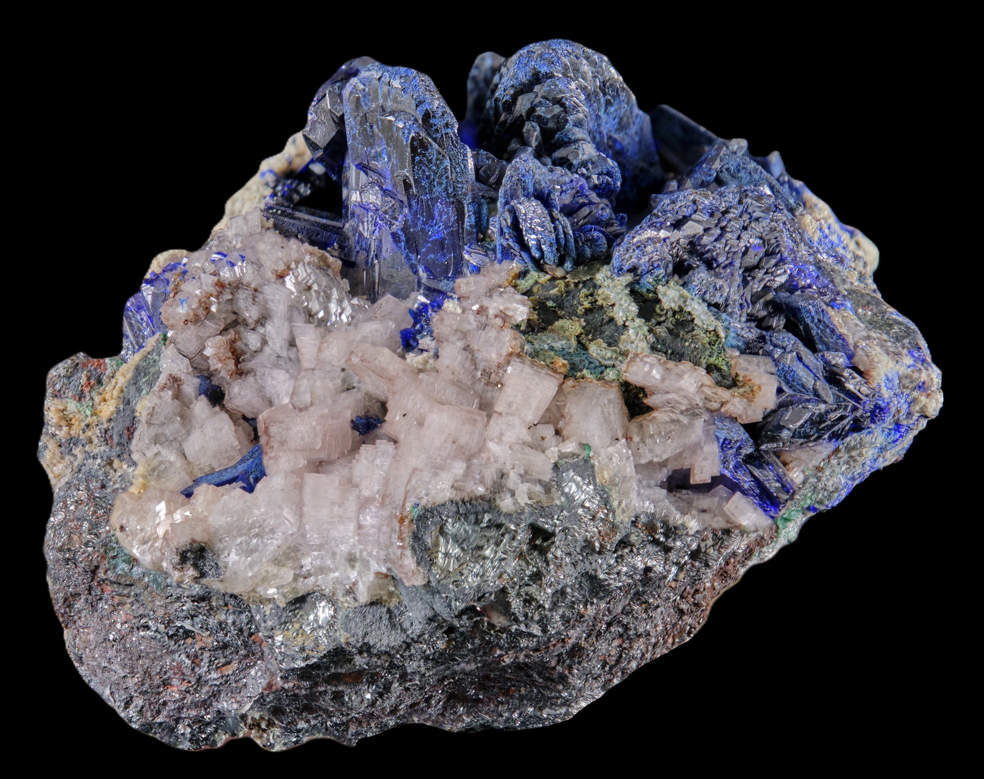 An interesting specimen featuring well-formed, rich indigo blue azurite crystals with an intriguing, curvilinear bladed habit. The azurite blades are in excellent condition and are complemented by pastel pink to white calcite rhombohedra. The latter fluoresce pastel orange red @320 nm. The groundmass is metallic ore with cuprite inclusions. This piece was sourced in the 1980s from the noteworthy South African dealer and collector Clive Queit, who would meet the miners at the mine exit during shift change to acquire the choicest and most unusual pieces. It has remained uncirculated in a private collection since acquisition.