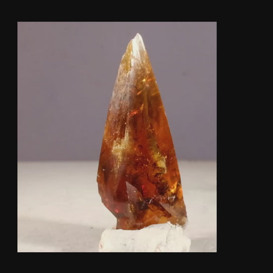 An exquisite, well formed, lustrous honey-amber barite crystal collected in 1983 from this world class locality. Translucent to transparent, with mesmerizing internal refraction, it presents glassy crystal faces with razor sharp edge work all around. The steep chisel-shaped termination is nearly perfect, but for a tiny bird nip on the back side. Fluoresces deep orange and phosphoresces lemon yellow under UV illumination.