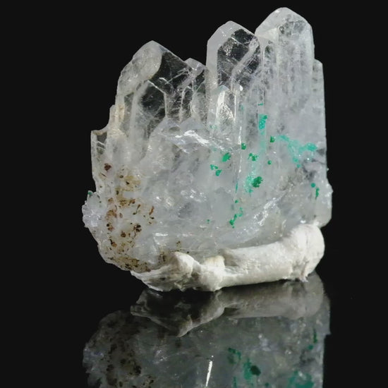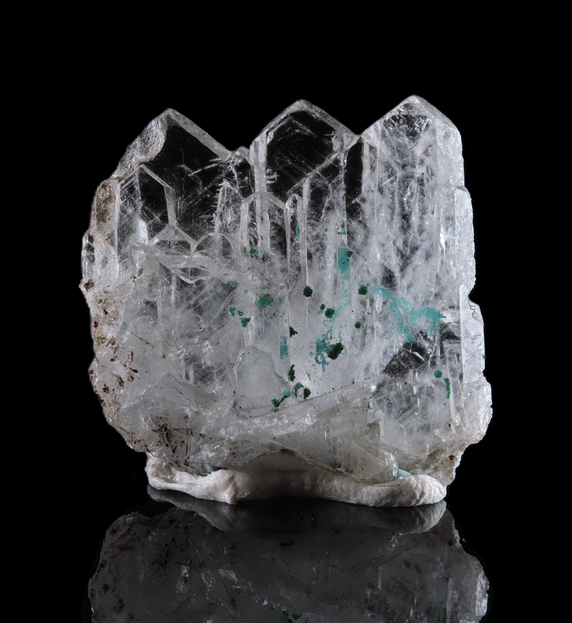A compound crystal with well-terminated, translucent to clear chisel points, adorned with kelly-green malachite druse. Some crystals are clipped, but remain visually appealing. Mindat states this now-exhausted locality produced the best baryte crystal clusters in Congo. Specimens from this classic site are hard to find, most having disappeared into collections.