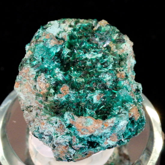 A breathtakingly exquisite presentation of radiating lustrous tufts of electric green acicular Brochantite crystals on a contrasting brown gossan matrix, which makes for a striking mineral specimen. This is an absolutely stunning specimen sourced from a fairly obscure Copper mine in the Congo and acquired from a Congo dealer many years ago.