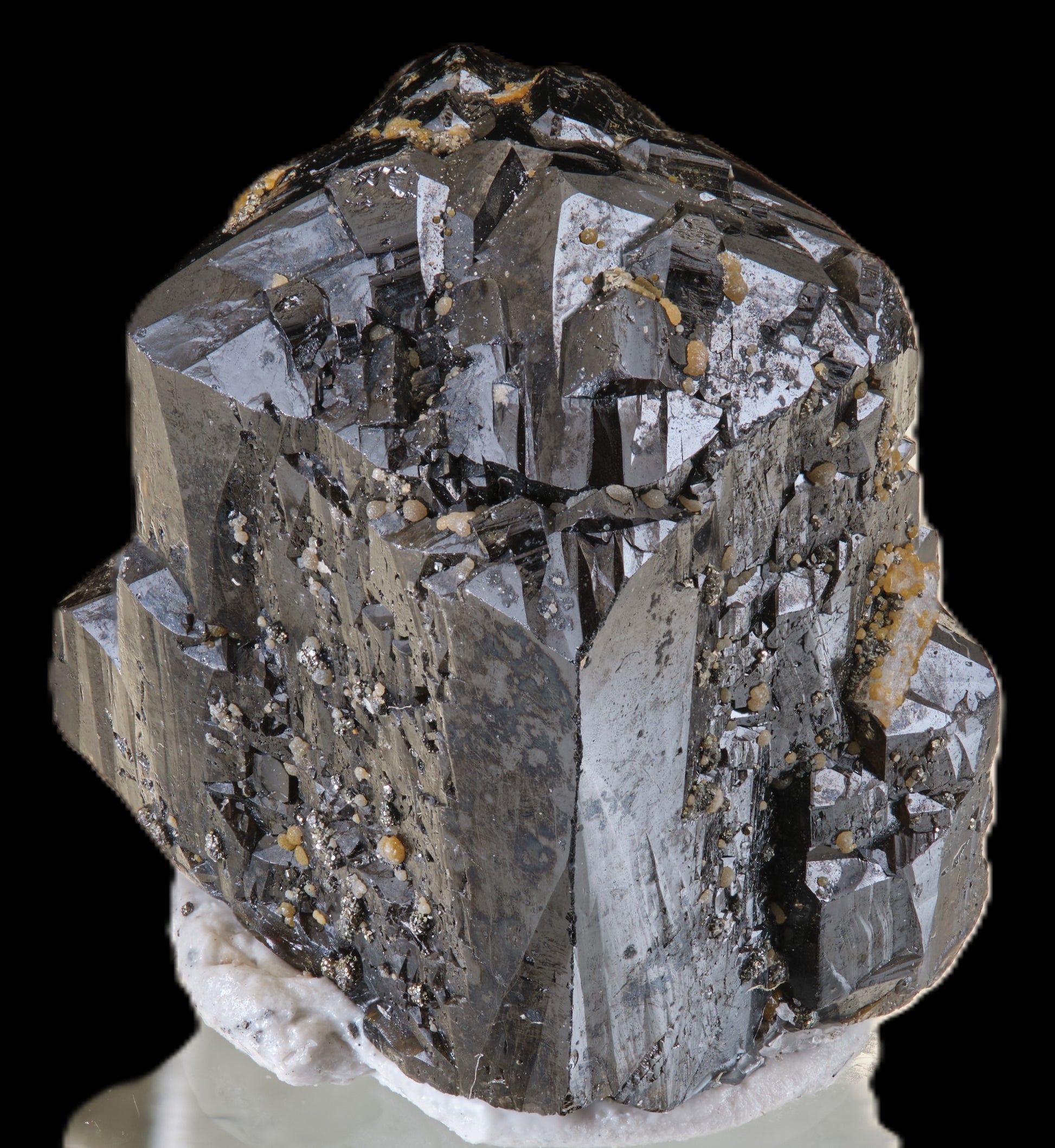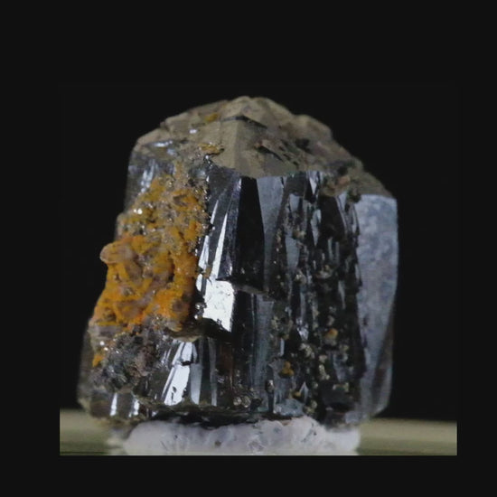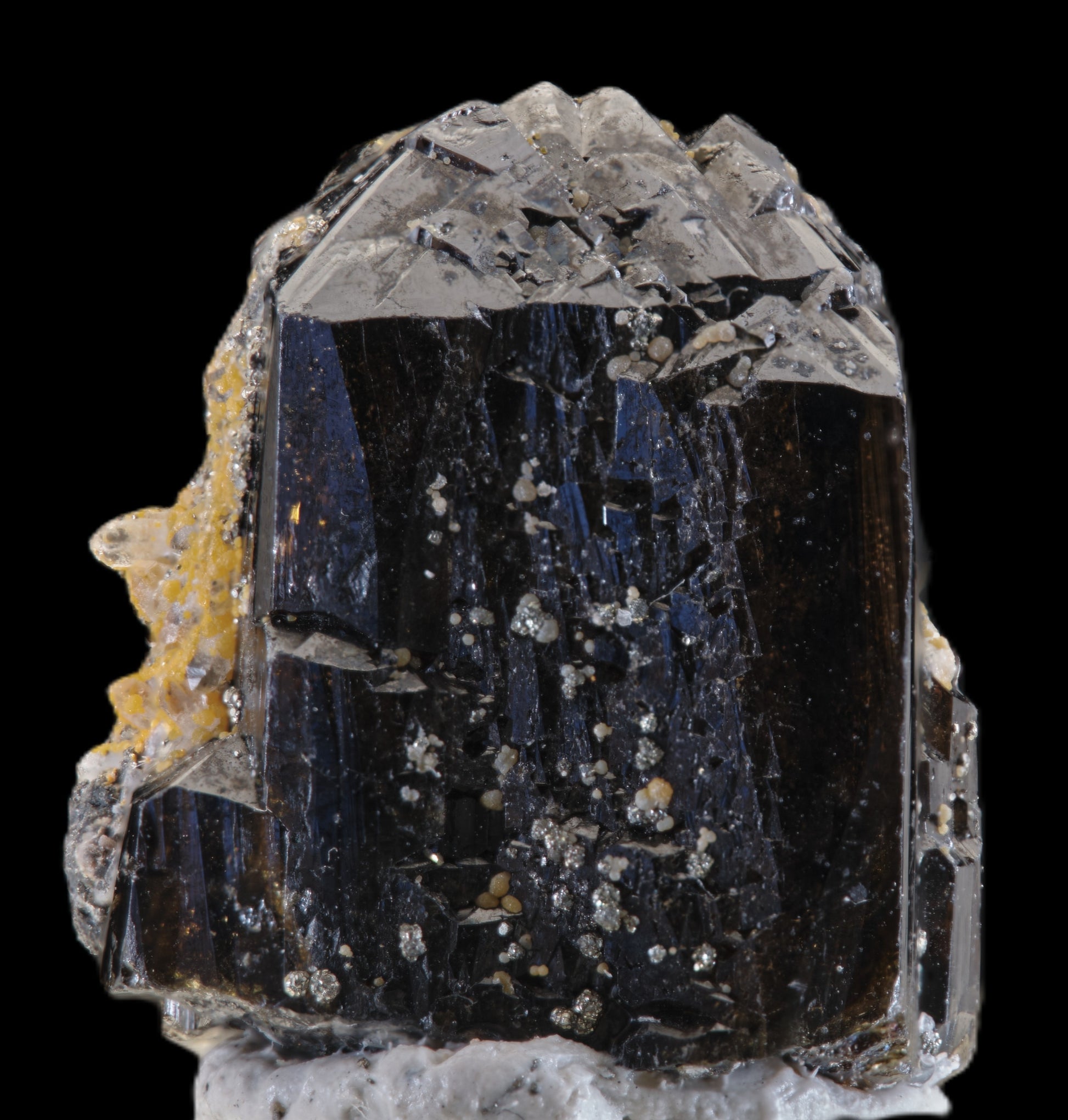 A single prismatic Cassiterite crystal, sourced from the world's richest cassiterite deposit. Presenting fine en-echelon faces, complete all around and very lustrous, with a fine crenelated termination. Quartz, pastel orange calcite, and pyrite provide an attractive contrast. High resolution macrophotography shows a white acicular mineral, which, based upon the known mineralogical associations, could be wavellite, but this is speculative. The mine at Huanuni is one of the largest tin mines in Bolivia, from where some of the more unique and attractive cassiterite specimens have been sourced, at present, though hard to find. This specimen is circa early 1980s vintage, judging from the typewritten label.