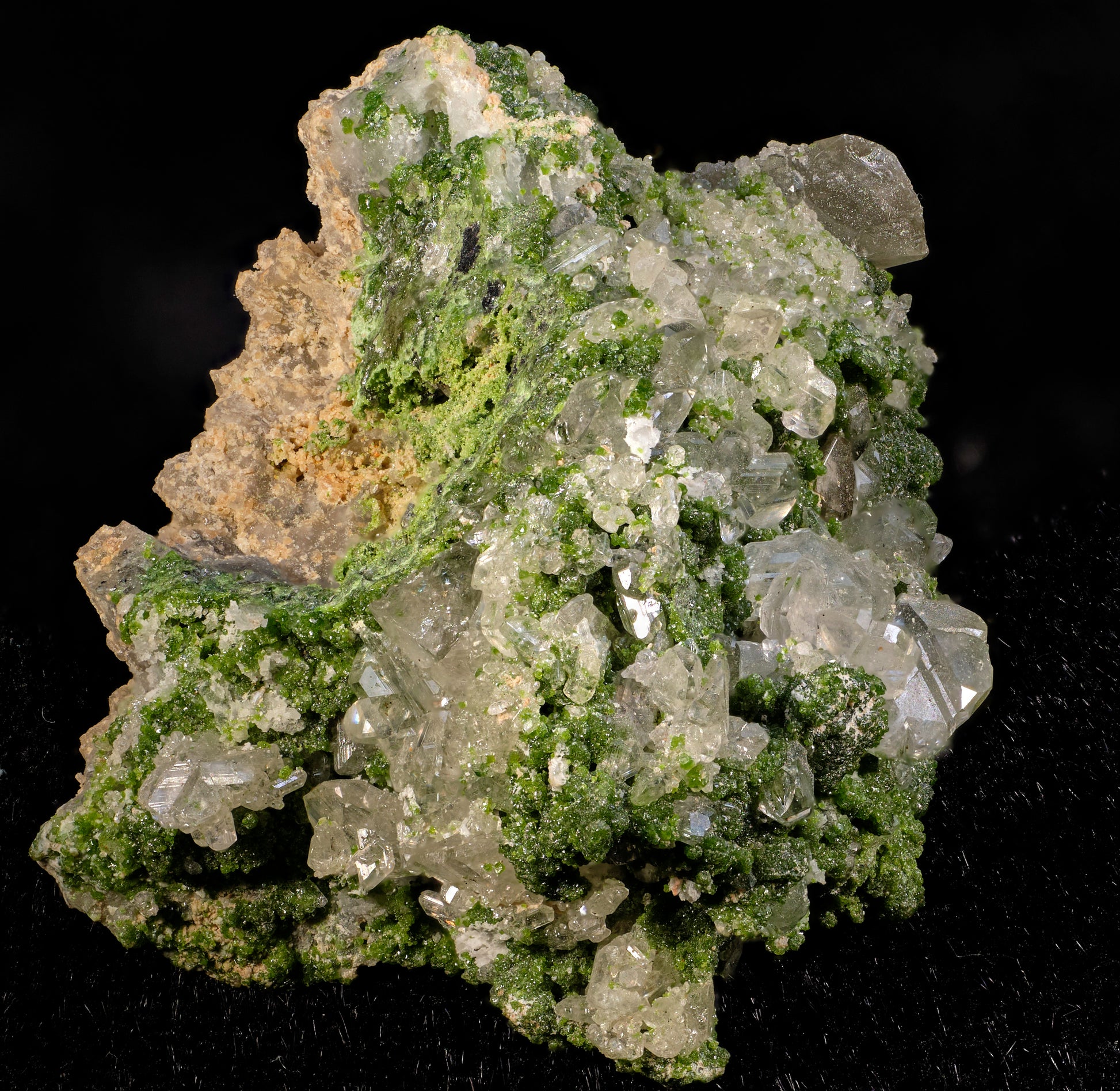 Bright crystals of water-clear, well-formed cerussite provide aesthetic contrast to vitreous, sparkling mint-green duftite. Tsumeb is the type locality for duftite, and the cerussite-duftite combination is iconic for this world-class locality. This is a very showy thumbnail specimen sourced from the renowned Tsumeb collector Clive Queit almost forty years ago. It has remained in a private collection ever since. As close to mine direct as you can get!