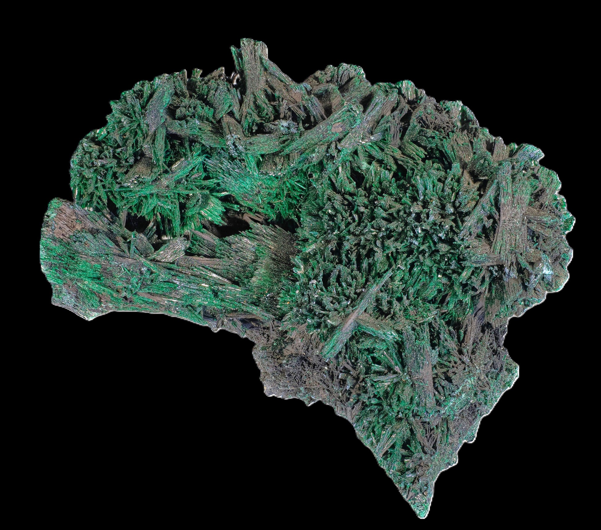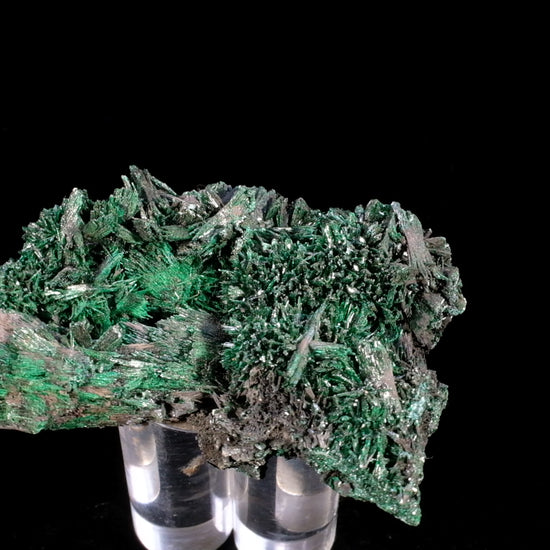 A very rare pseudomorph of platy, pine green malachite after baryte, with secondary growths of shimmering acicular (needle-like) crystals. The locality produced the best baryte crystal clusters in the Congo; however, specimens are relatively uncommon. These malachite after baryte pseudomorphs appeared in Tuson in the early 2000s, but none have since. This seldom-seen, exceptional, and showy specimen is, IMHO, competition-class.