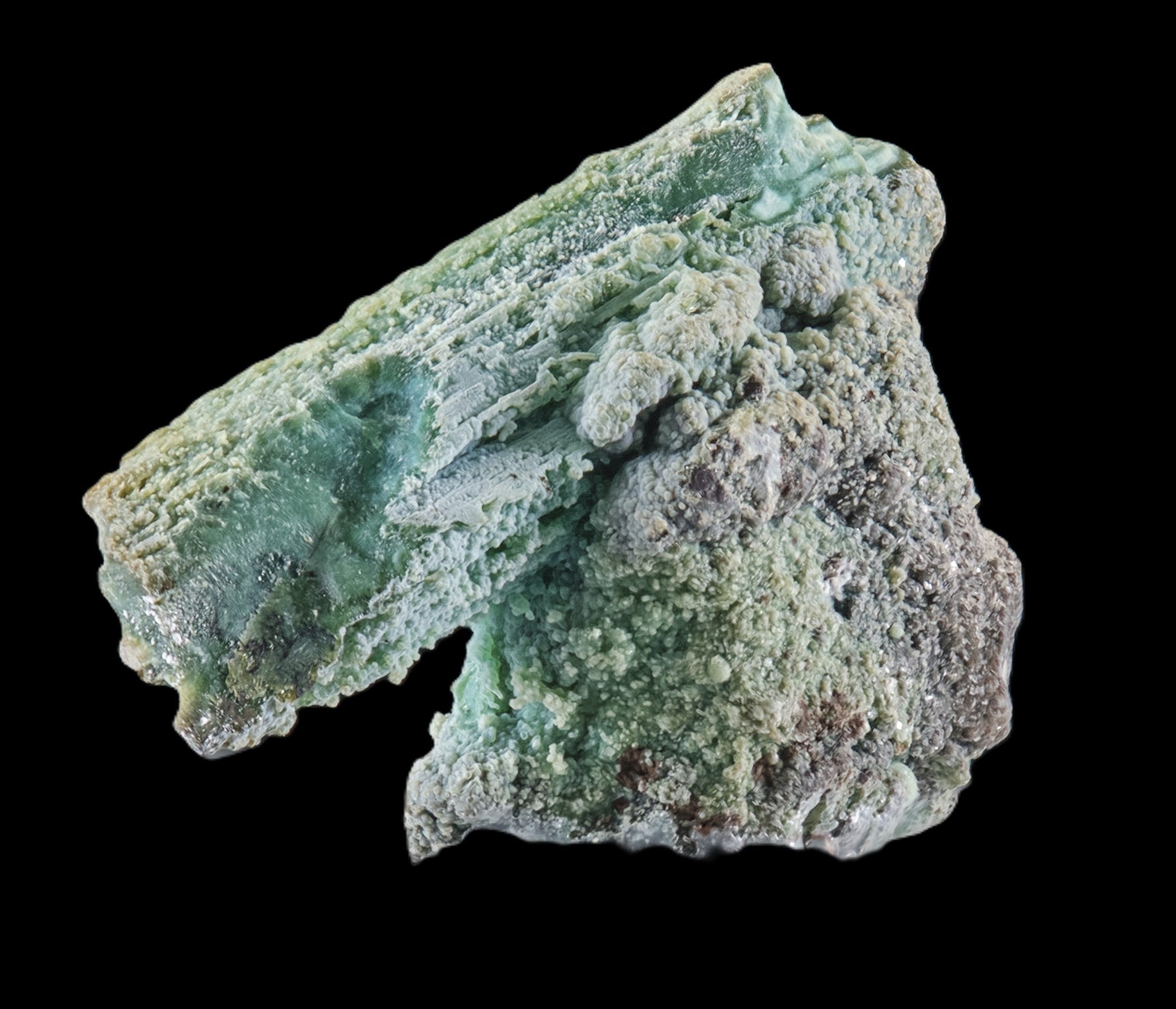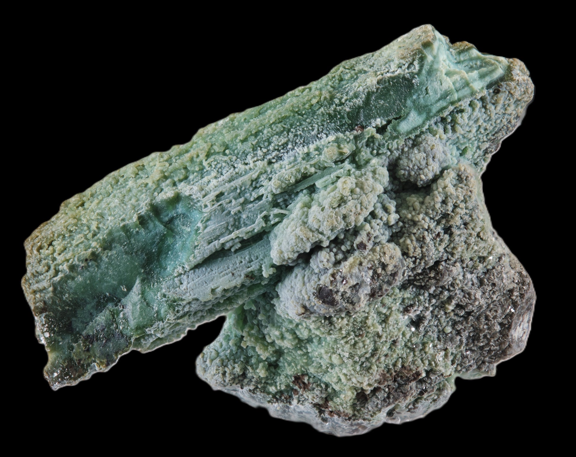 An intriguing specimen of Chrysocolla as a pseudomorph after Selenite, presenting both linear and botryoidal architecture while preserving the original bladed form. Cutaways reveal subtle compositional banding due to variations in molecular content, s.a. copper. The typewritten label places the specimen in the 1960s to 1970s.