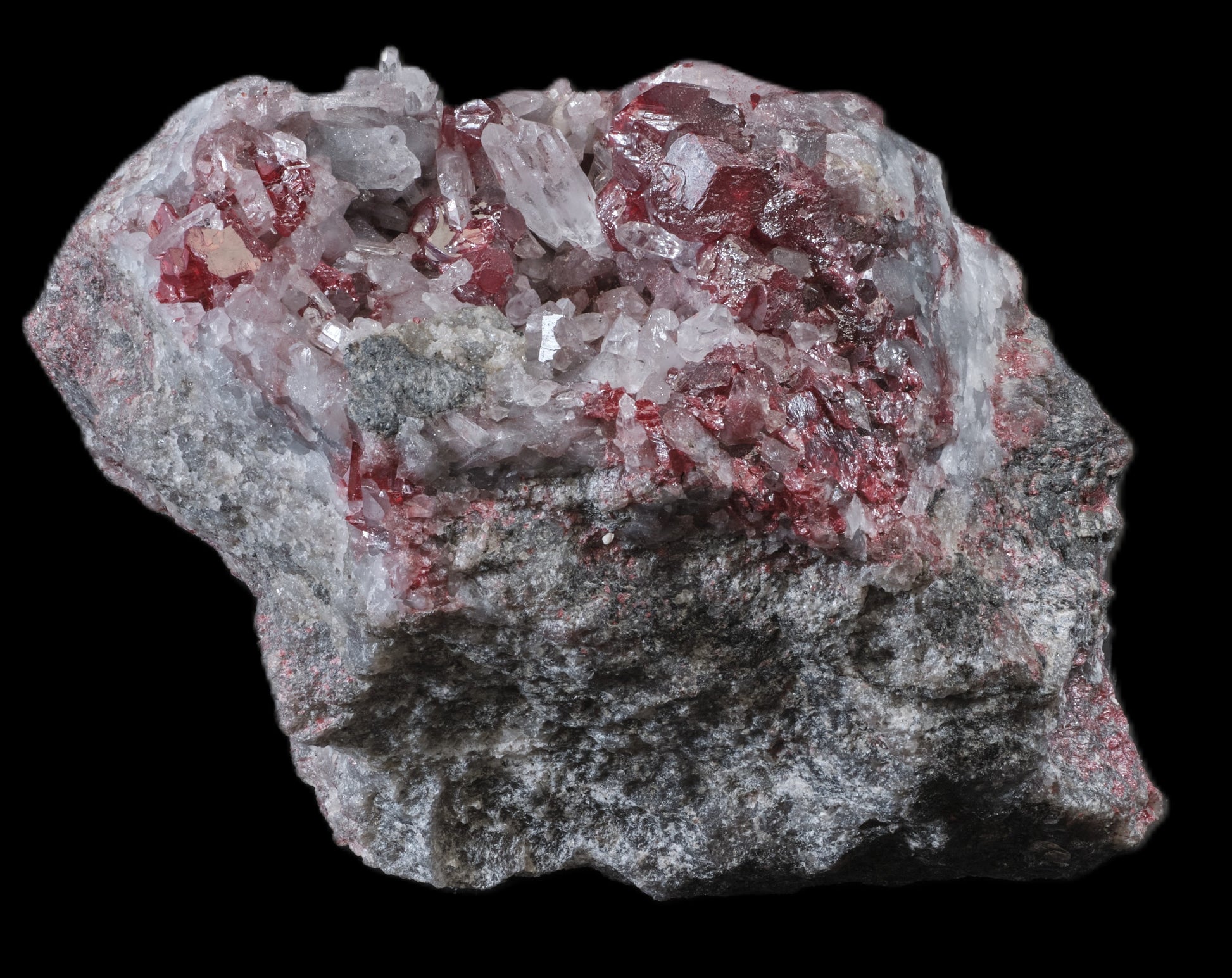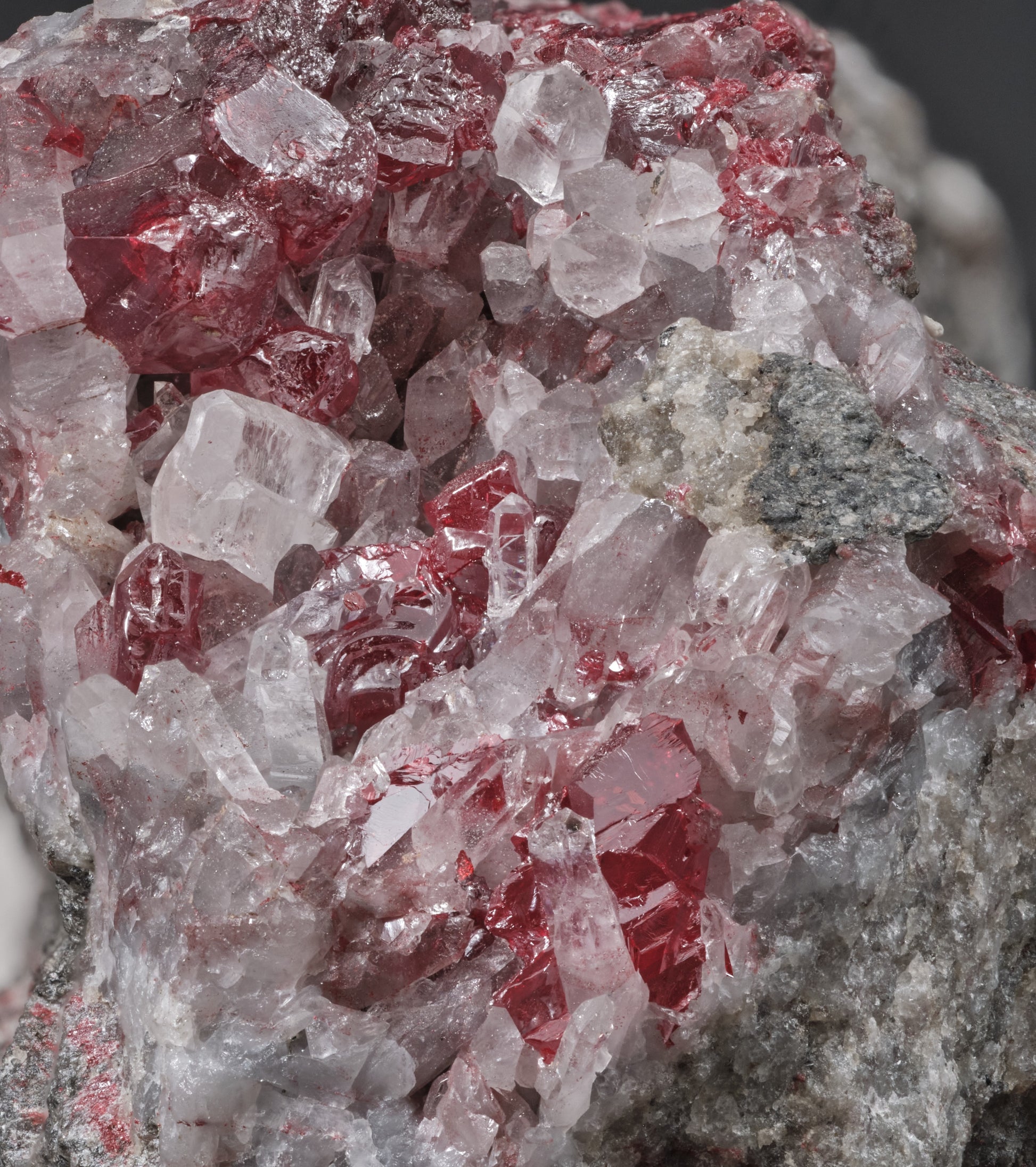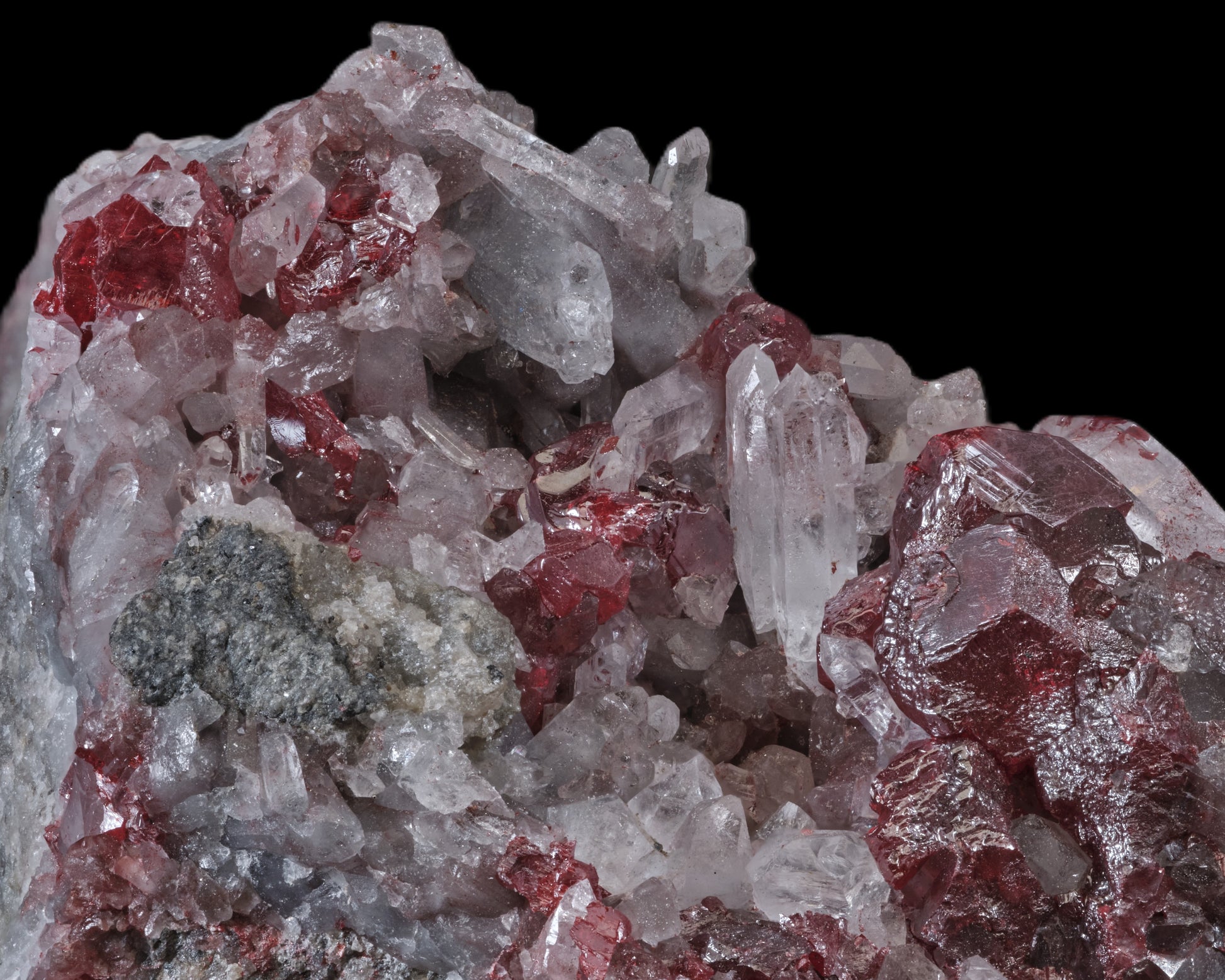 Bright, translucent cinnabar crystals with intense color and striking brilliance are nestled within a host rock with complementary small Quartz crystals. The variation in crystal morphology is quite striking, with unusual polycrystalline growths, curvilinear habits, and vibrant gemmy encrustations. A Spanish classic, the world-class mines at Almaden have been in production since at least the Roman Age, and perhaps as far back as Neolithic times.