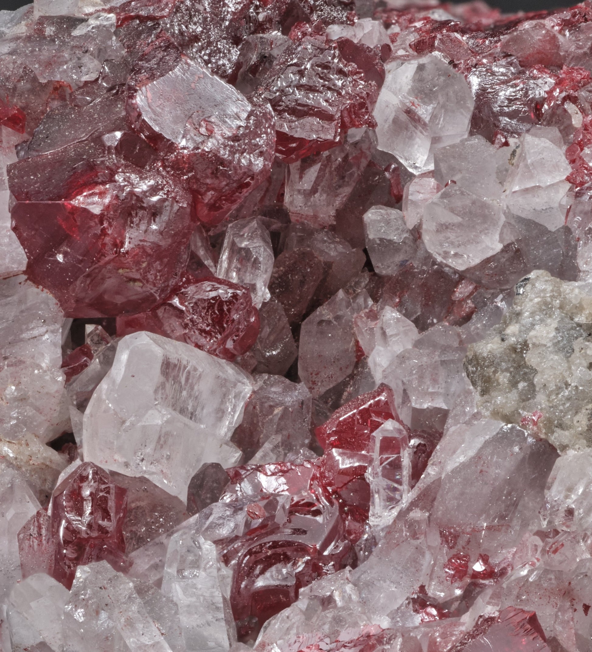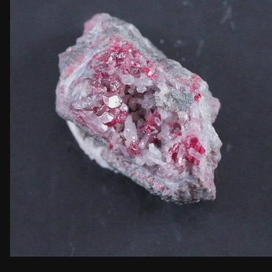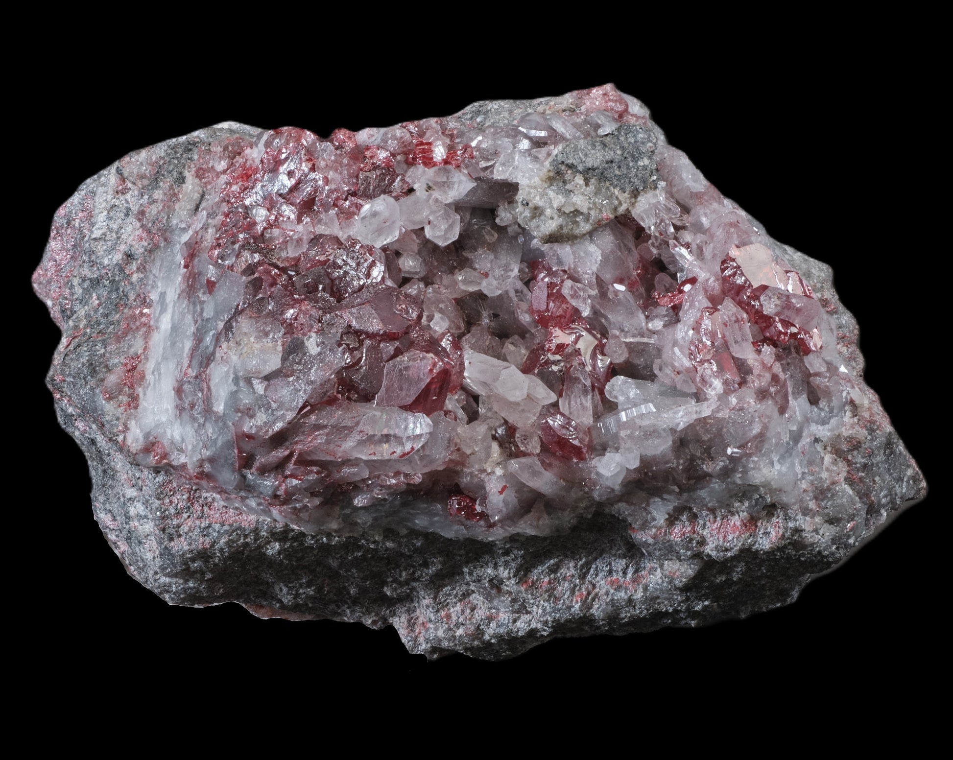 Bright, translucent cinnabar crystals with intense color and striking brilliance are nestled within a host rock with complementary small Quartz crystals. The variation in crystal morphology is quite striking, with unusual polycrystalline growths, curvilinear habits, and vibrant gemmy encrustations. A Spanish classic, the world-class mines at Almaden have been in production since at least the Roman Age, and perhaps as far back as Neolithic times.