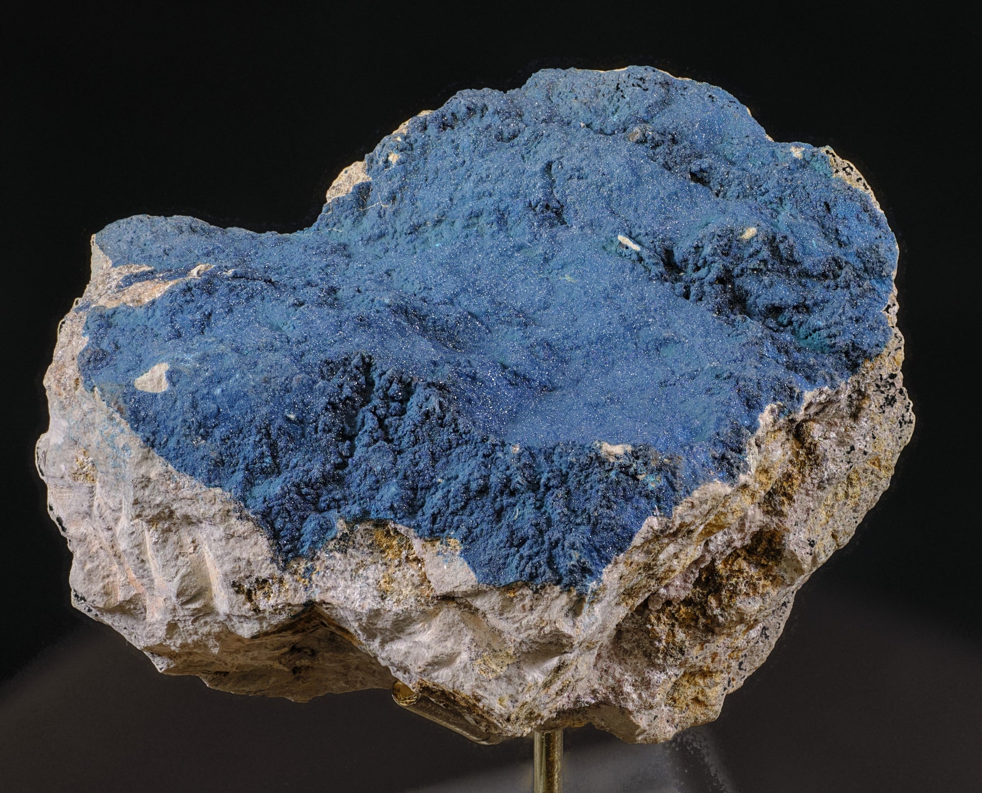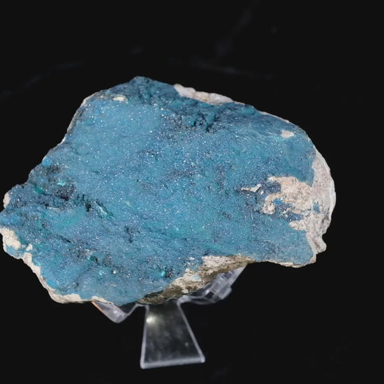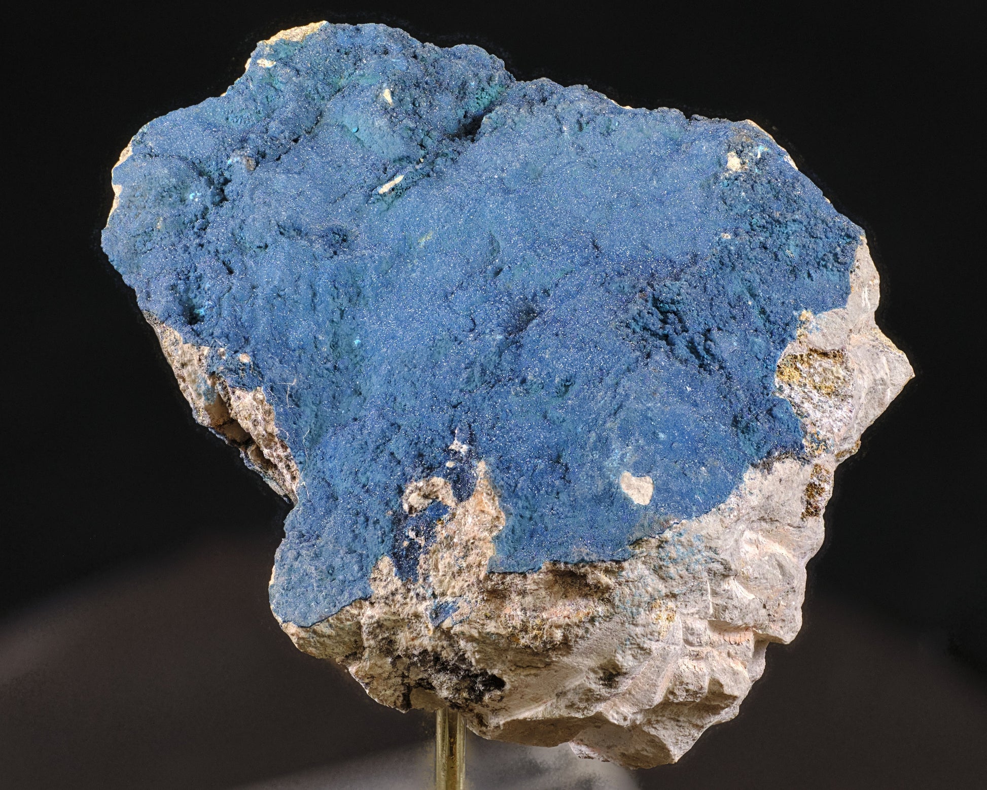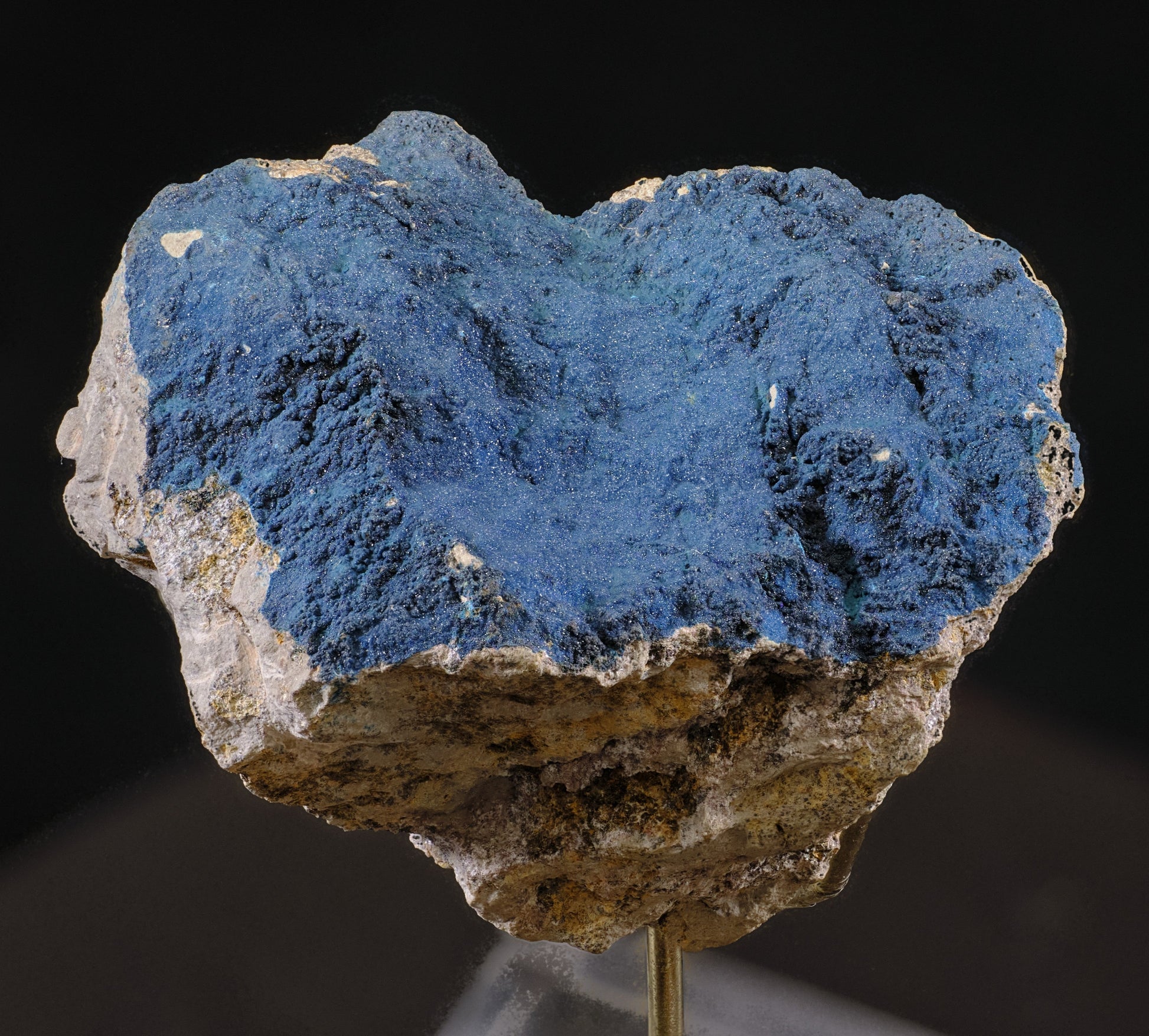 Microcrystalline aggregates of lovely coeruleum blue cornetite, on nicely contrasting light tan host rock, with minor chrysocolla. This specimen is self-standing and presents those eye-popping sparkly shades of blue for which cornetite is so coveted. Cornetite is a rare secondary copper phosphate and the L'Etoile du Congo (“Star of the Congo”) Mine is the type locality. The mine is now closed, and specimens from the type locality rarely come to market.