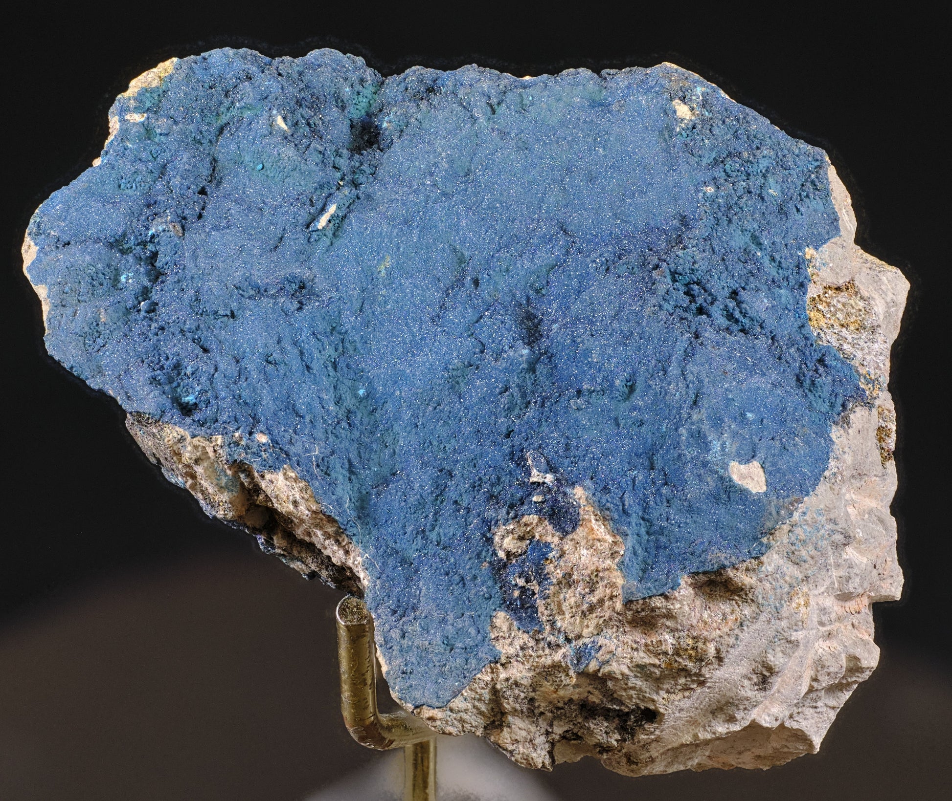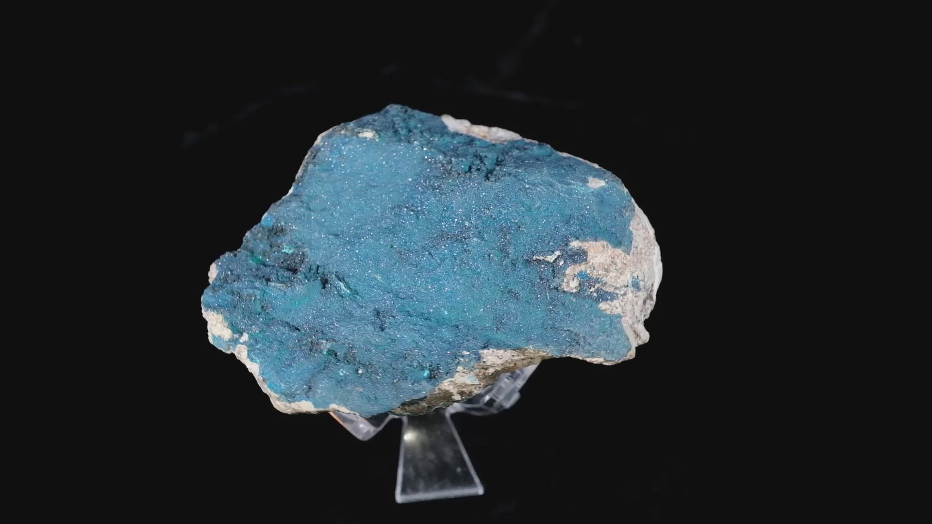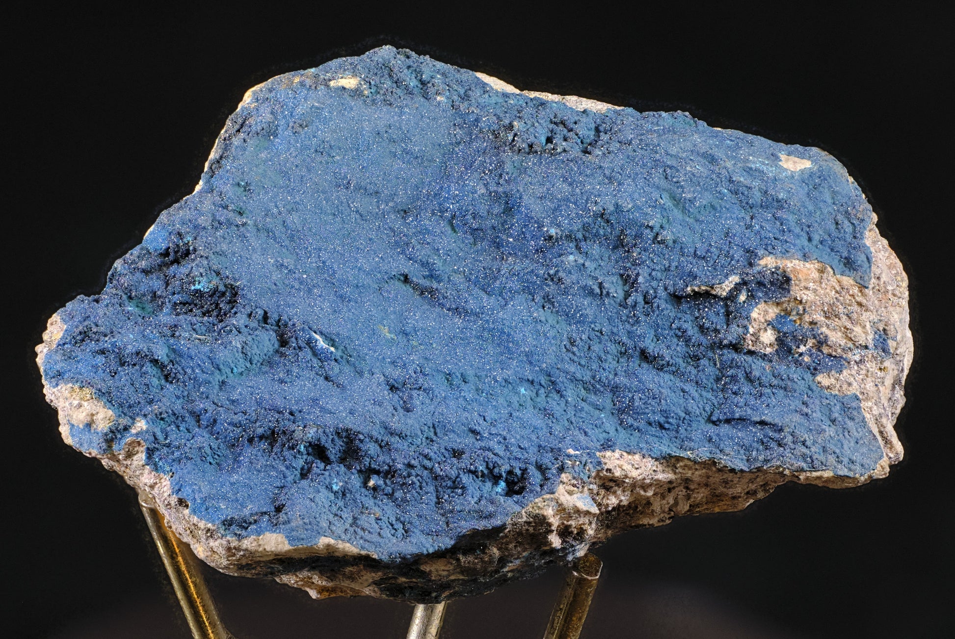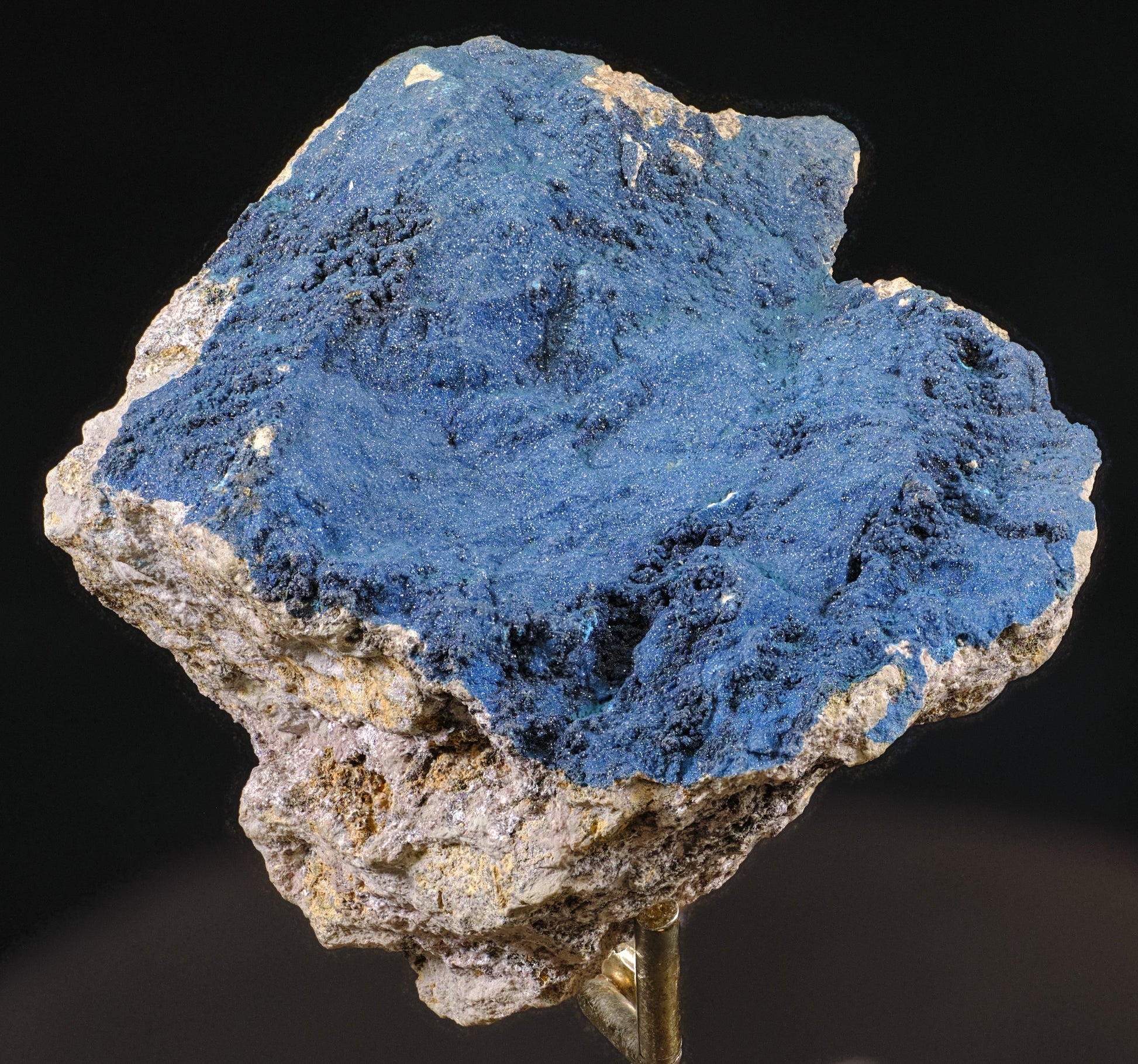 Microcrystalline aggregates of lovely coeruleum blue cornetite, on nicely contrasting light tan host rock, with minor chrysocolla. This specimen is self-standing and presents those eye-popping sparkly shades of blue for which cornetite is so coveted. Cornetite is a rare secondary copper phosphate and the L'Etoile du Congo (“Star of the Congo”) Mine is the type locality. The mine is now closed, and specimens from the type locality rarely come to market.