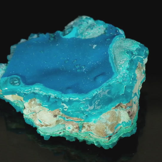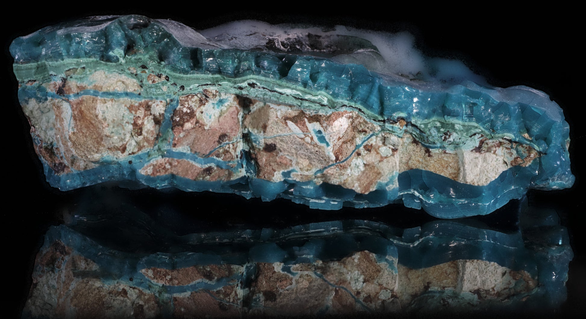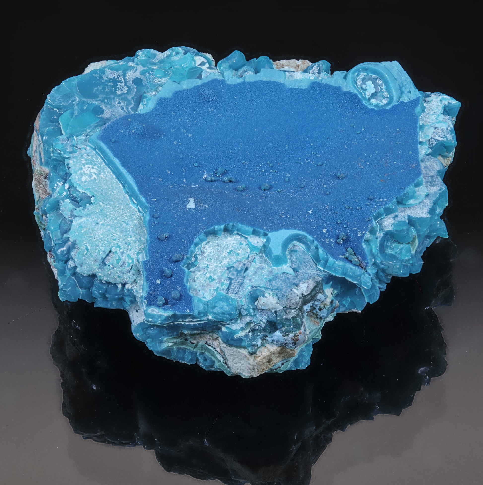 A striking and beautiful combination specimen, presenting a surface layer of intense, sparkling, royal-blue Cornetite over sublime, electric-blue, gel-like banded chrysocolla. Small botryoids of chrysocolla are perched on the cryptocrystalline cornetite. The interior core of highly brecciated sandstone is surrounded by a layer of sublime banded malachite. The interior side view captures a violent diagenesis, with bands of gel chrysocolla and malachite flowing through and around remnant brecciated fragments of nicely contrasting light tan host rock. The colors are just amazing, with the cornetite and the malachite nicely framing and complementing the chrysocolla. Cornetite is a rare secondary copper phosphate, and the L'Etoile du Congo (“Star of the Congo”) Mine is the type locality. The mine is now closed, and specimens from the type locality rarely come to market. I have examined all the photos available in Mindat's public archives, and this particular gel Chrysocolla association seems quite unusual, not to mention jaw-dropping gorgeous.