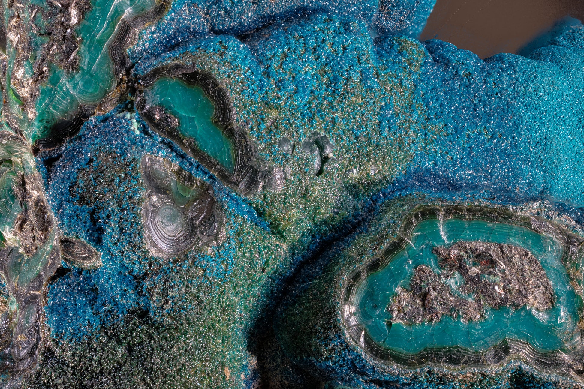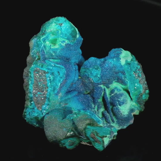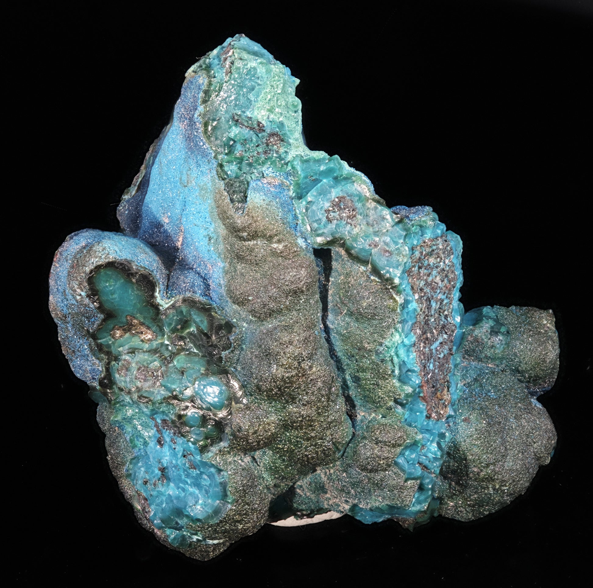 This rich, sculptural small cabinet specimen presents stalactitical and reniform masses of banded blue-green, gemmy chrysocolla coated by spherical aggregates of translucent Brunswick-green pseudomalachite, in turn coated by a first-generation layer of electric blue cornetite, yielding to a later stage royal-blue form. A final coating of light green microcrystalline species forms a pleasing complement to the cornetite. Other areas feature concentric zones of deep green to teal blue banded chrysocolla yielding to a core of cryptocrystalline material, which appears to be comprised of probable heterogenite (black), along with apple green libethenite (?) sprinkled with turquoise blue grains of chrysocolla. The piece has not been analyzed, and additional species are likely to be present. The base includes patches of bubbly, translucent dark heterogenite. As seen in the video, the effect of the sparkling, variegated hues coupled with the glassy chrysocolla banding and cryptocrystalline cores is pure eye candy. Self-standing.