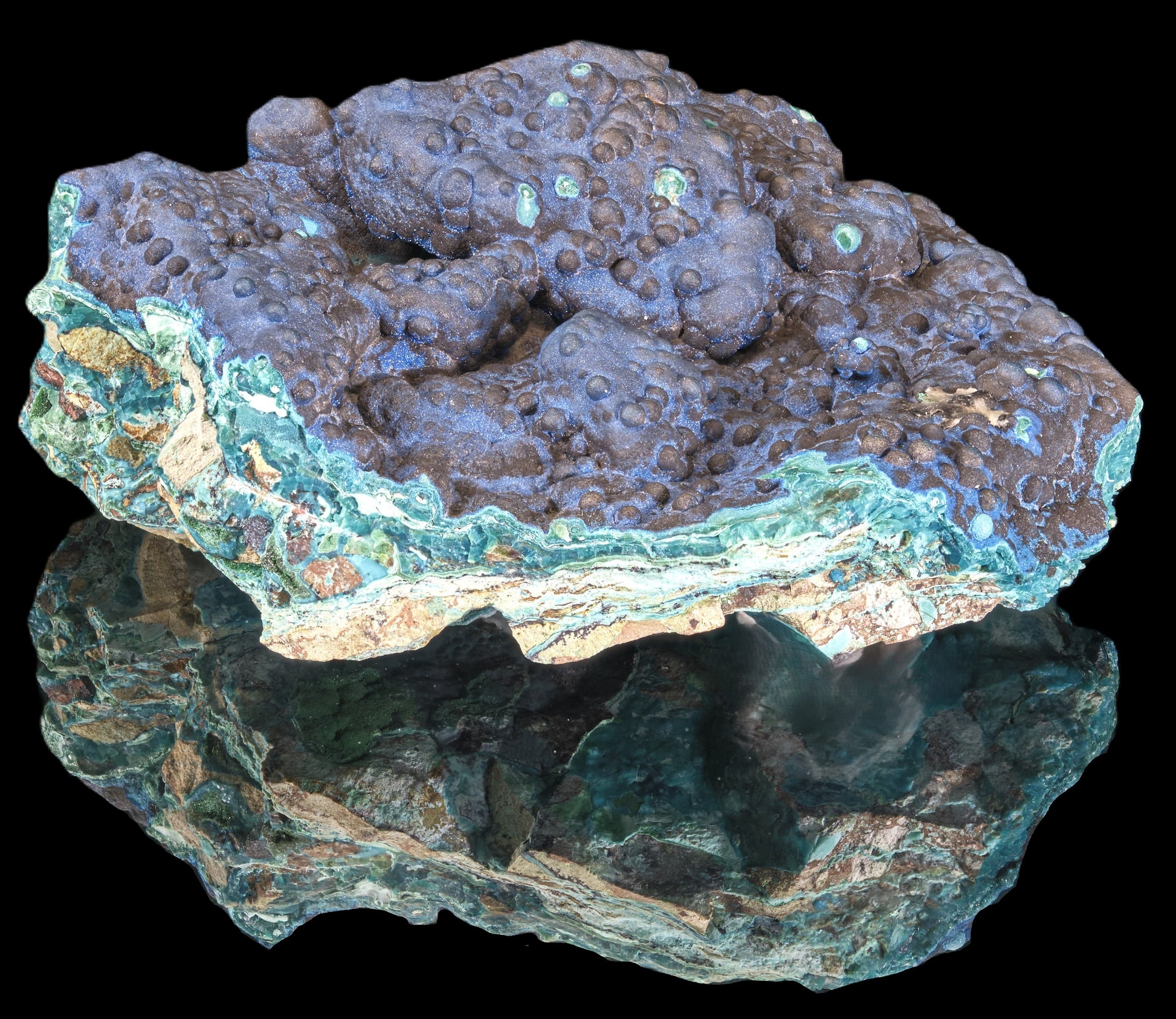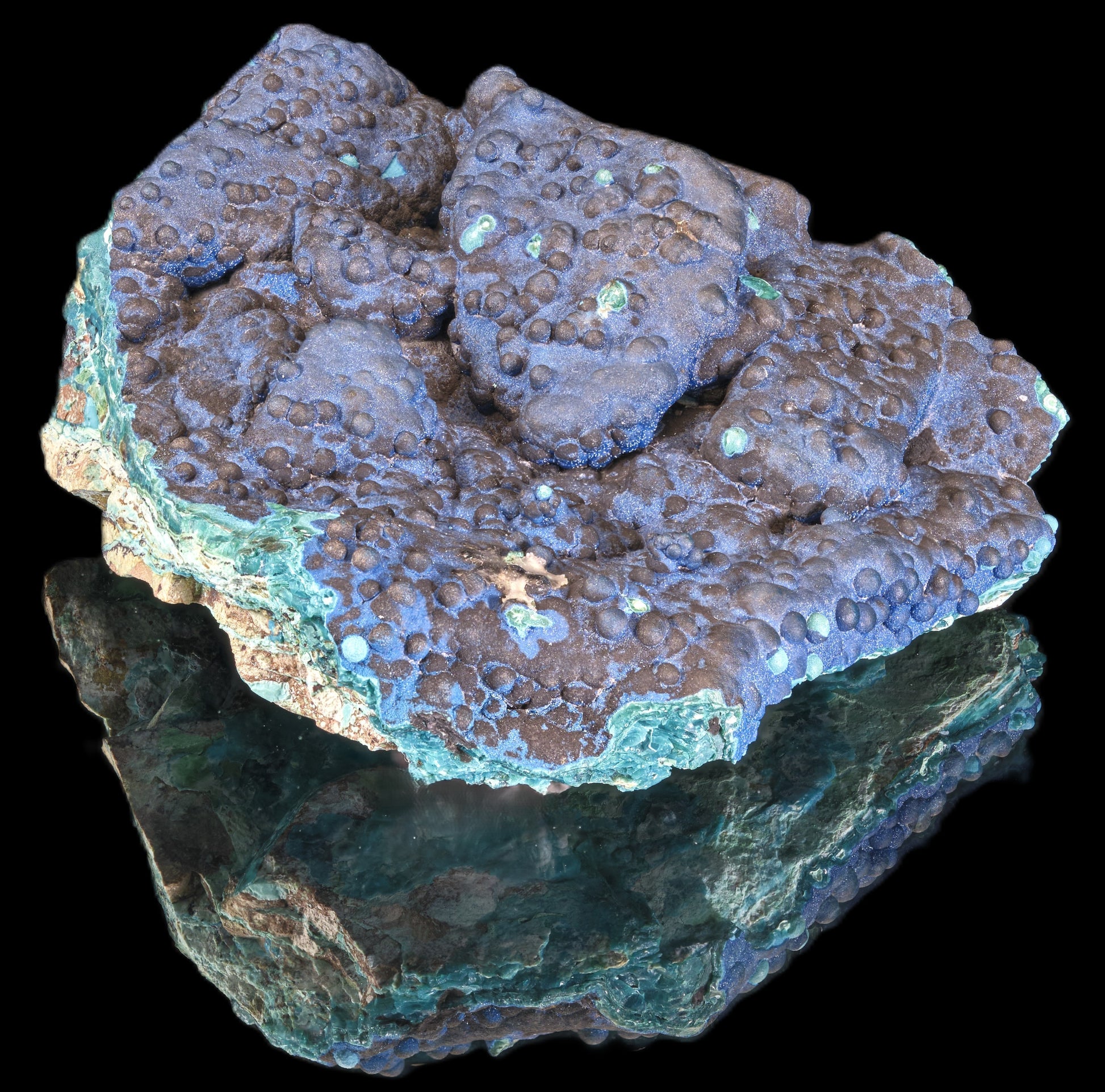 Cornetite is a rare secondary copper phosphate, and the L'Etoile du Congo (“Star of the Congo”) Mine is the type locality. The mine is now closed, and specimens from the type locality rarely come to market. This rich, sculptural small cabinet specimen presents stalactitical and reniform masses of banded blue-green, gemmy chrysocolla coated by spherical “knobbly” aggregates of translucent Brunswick-green pseudomalachite, in turn coated by a first-generation layer of electric blue cornetite, yielding to a later stage royal-blue form. The side views capture a violent diagenesis, with the bands of gel chrysocolla and sublime malachite-encrusted cavities flowing through and around remnant brecciated fragments of nicely contrasting light tan host rock. The geometries, textures, colors, and habits are just amazing, not to mention jaw-dropping gorgeous.