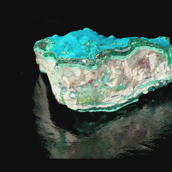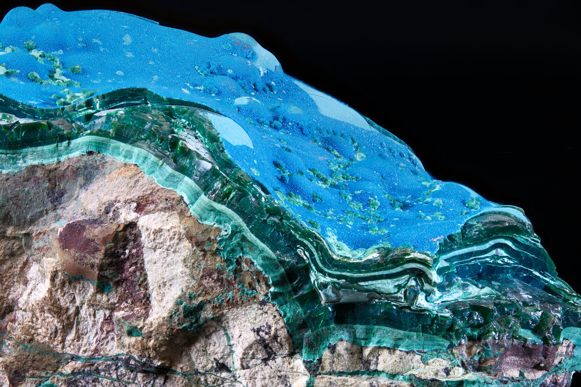 A striking and beautiful combination specimen, presenting a surface layer of intense, royal-blue Cornetite over sublime, deep green to blue gel chrysocolla bands. The surface is punctuated by “bubbly” botryoidal forms and sprinkles of green malachite. The side view captures a violent diagenesis, with bands of gel chrysocolla and malachite flowing through and around remnant brecciated fragments of light tan host rock. The colors are just amazing, with the cornetite and the malachite nicely framing, and complementing, the chrysocolla. Cornetite is a rare secondary copper phosphate, and the L'Etoile du Congo (“Star of the Congo”) Mine is the type locality. The mine is now closed, and specimens from the type locality rarely come to market. I have examined all of the photos available in Mindat's public archives, and this particular gel Chrysocolla association seems quite unusual, not to mention jaw-droppingly gorgeous.
