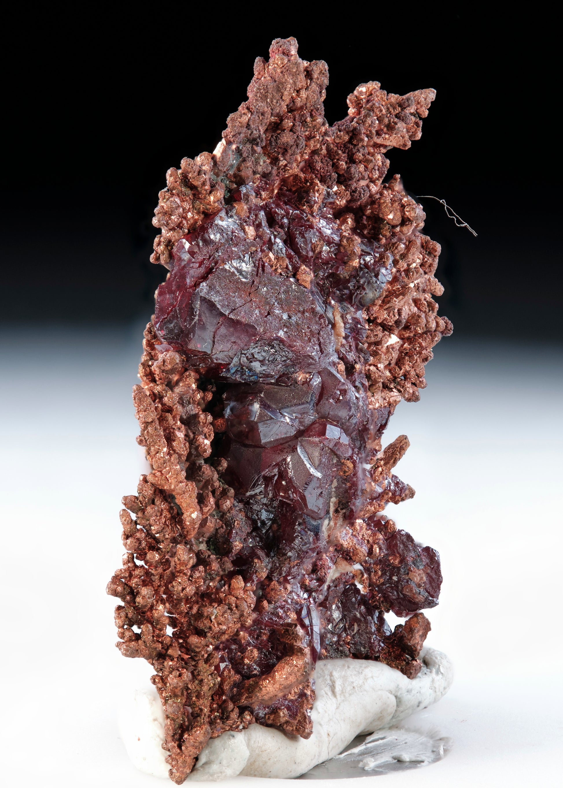 A superb and classic, sparkling, two-sided specimen from this historic locale featuring flattened, strikingly arborescent copper overlain by burgundy-red, opaque to translucent cuprite crystals. The copper crystals are very bright with sharp edgework, forming well-defined faces and presenting both spinel twinning and elongate tetrahexahedral habit. The cuprite exhibits penetration twinning, resulting in complex rosette-like geometries, along with classic textbook pseudo-octahedral and cubic habits. Crystal faces have an adamantine to sub-metallic luster, with deep red fire under direct lighting. Minor bird nips are apparent under magnification however these do not detract from the visual presentation. A fine and noteworthy classic from a historic locality, sourced from a forty-year-old collection.
