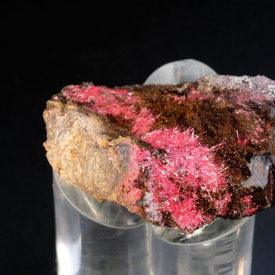 Chalcotrichite, (from the Greek, “hairy copper”, in old-timer days known as “wire copper”) is an uncommon, highly coveted variety of the copper oxide cuprite. This spectacular, richly appointed specimen from the world-class Daye Ye Mine presents a chaotic, shimmering mass of electric, metallic-crimson needles. As seen in the video, the play of light over the primary area of mineralization (measuring over 3.5 cm in length!), produces a sparkling effect that is mesmerizing. The Daye Mine chalcotrichites made their debut in Tucson in 2004, and since then have become increasingly rare and difficult to acquire in the marketplace.