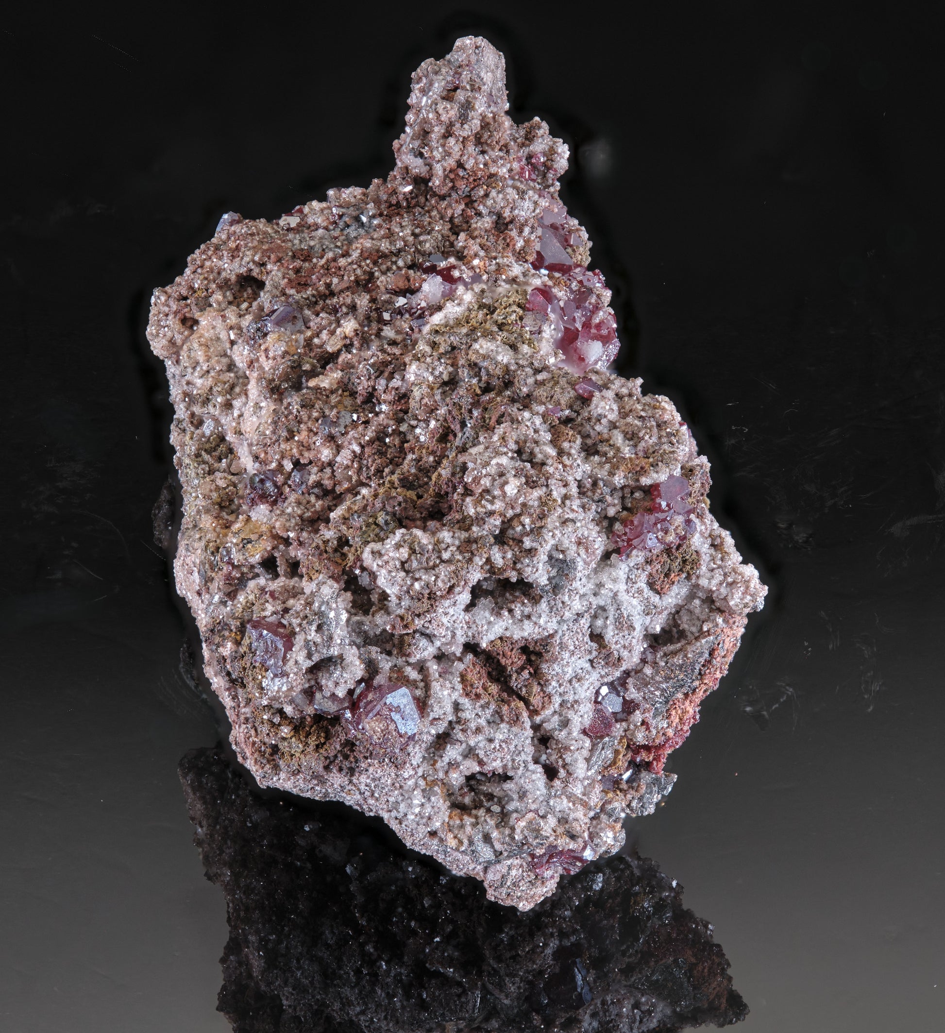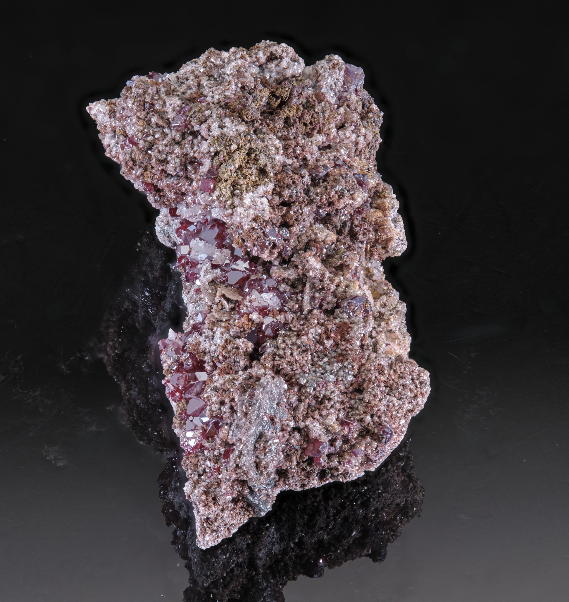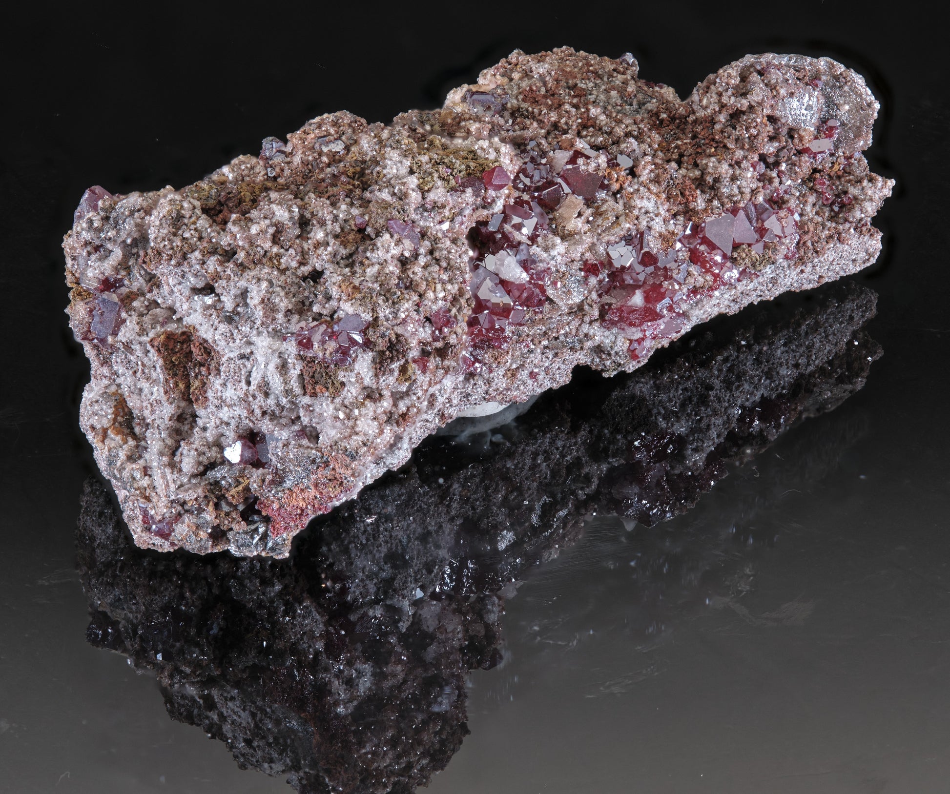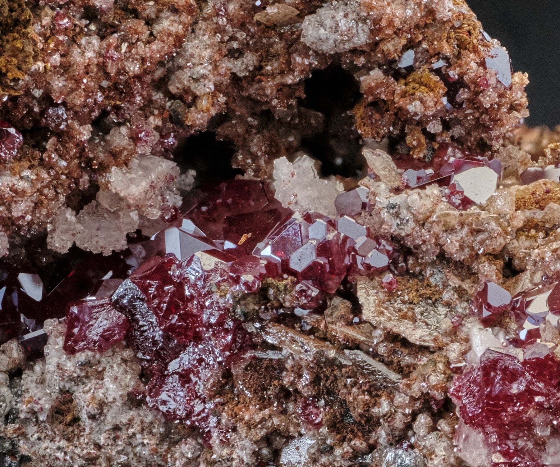 This TN features exquisite, gemmy, ruby- to cochonal-red cuprite crystals with textbook habit, adamantine luster and abundant, complex penetration twinning. Many are flawless and transparent, with glittering, mirror-smooth faces. Lustrous, water-clear calcite rhombehdra add aesthetic contrast. The wulfenite crystals are pastel yellow and translucent, and for the most part mm-size, but for one prominent crystal measuring 5 x 8 mm perched prominently on one end of the specimen. It is completely encrusted with small xls of water clear calcite rhombs, hexagonal prismatic mimetite, gemmy cuprite and – possibly – ankerite (not analyzed). This noteworthy specimen was sourced from the renowned Tsumeb collector Clive Queit almost forty years ago and has been uncirculated in a private collection ever since.