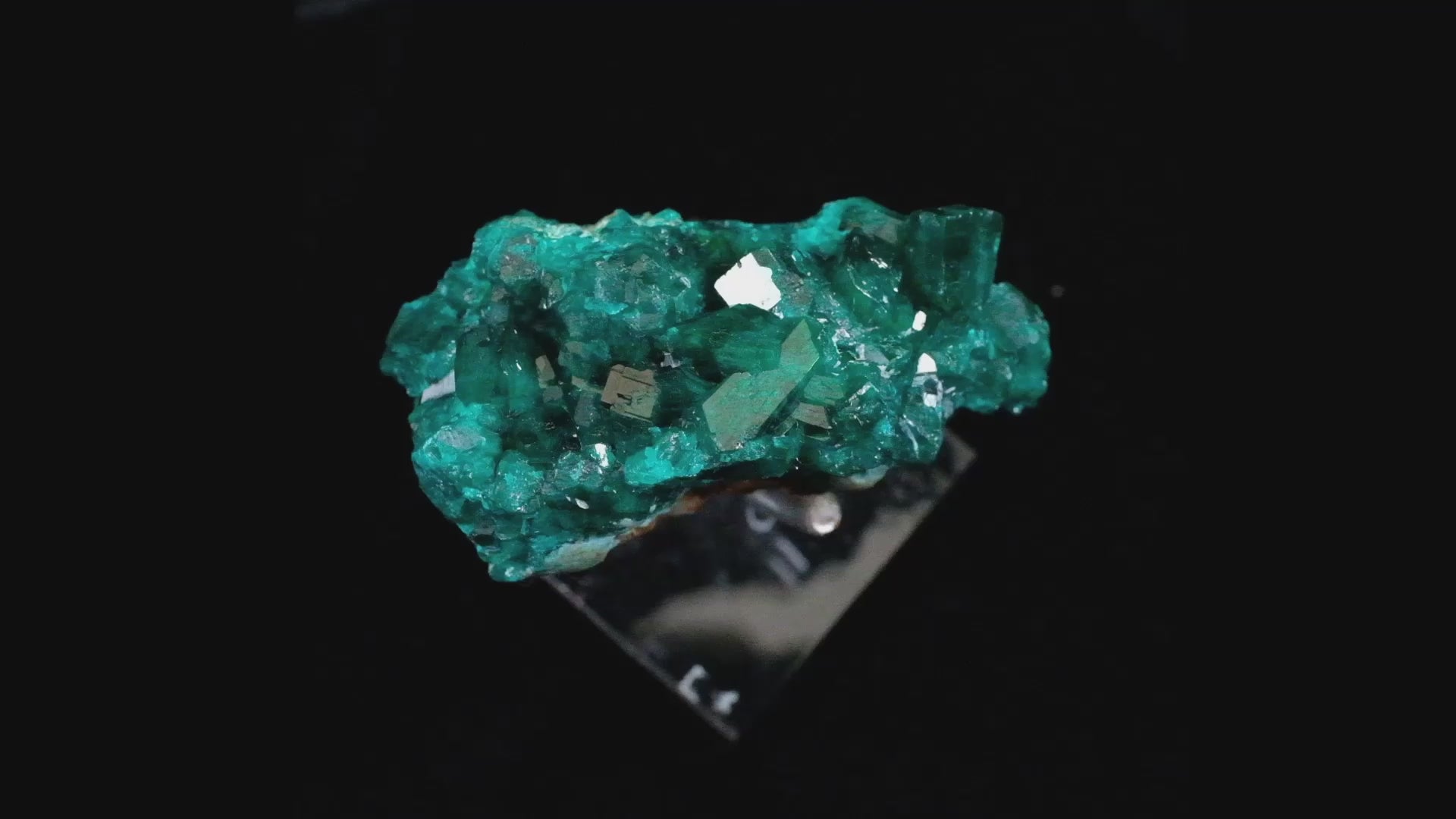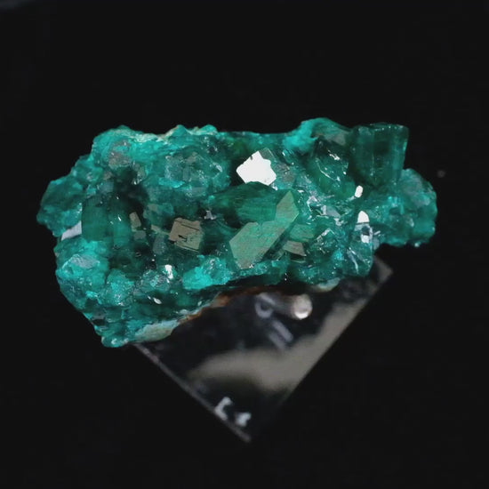 An architecturally complex Tantara Dioptase, presenting large, gemmy, deep emerald-green crystals with striated to glassy faces and intricate geometric patterns. The reflections and internal refraction are striking. This is a nice, small cabinet piece presenting some peripheral separation features. Sourced from a forty-year-old collection.