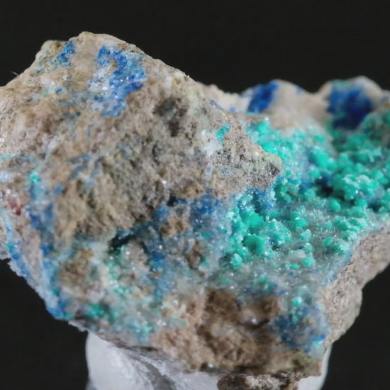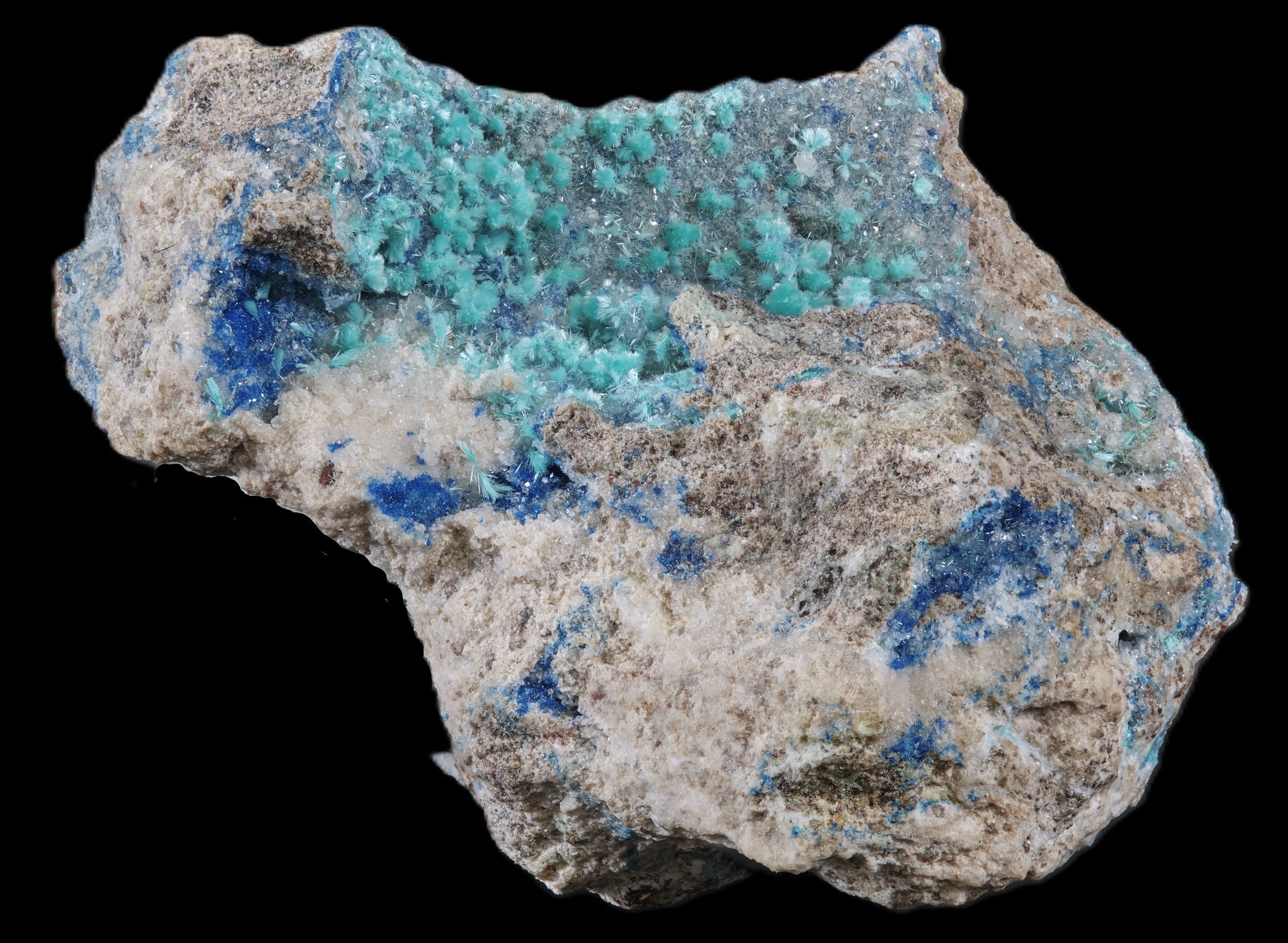 This TN showcases emerald-green dioptase in needle-like stellate sprays and bowties, alongside bright blue Kinoite crystals that sparkle like tiny gemstones. The kinoite occurs both as free-standing crystals (which is unusual), and as inclusions within glassy, water-clear apophyllite* crystals. The extinct mine is one of Arizona's most esteemed mineral localities and a classic USA site.
