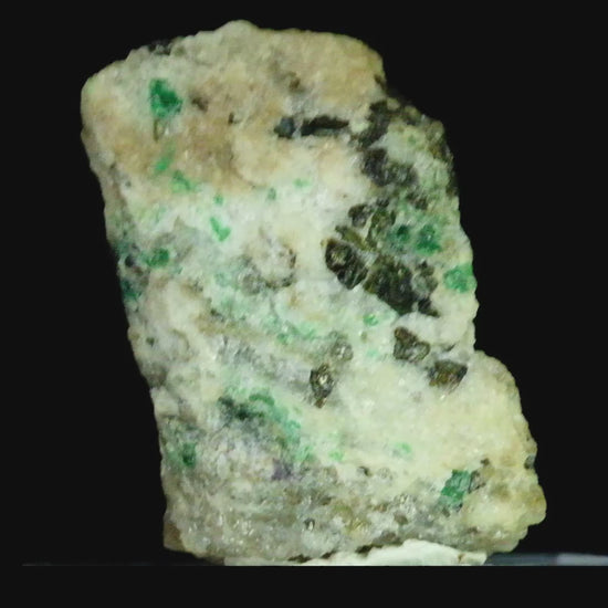 This quintessential Crabtree Mine thumbnail/ miniature is richly endowed with green emerald in a matrix of quartz, accompanied by Fluor-Dravite and minor Fluorite and Xenotime. This is a highly representative example from this well-known locale, one of the only commercially producing emerald mines in the United States, now open only for collecting in the dumps. It is very unusual to find any Crabtree emeralds in matrix, let alone with these known associations, as they are highly sought after by collectors, and most specimens found today are cut into cabochons.
