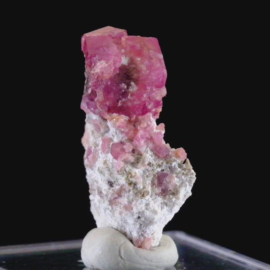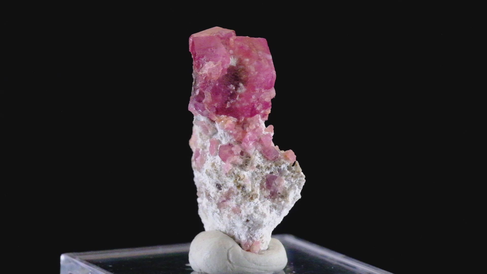 A striking, lustrous, translucent raspberry pink Grossular garnet from the classic finds at Sierra de Cruces, a well-known and coveted locality. This is a compound crystal, comprised of several intergrown dodecahedra. What I especially like about this is that it is a matrix piece: so many remaining in the dwindling market are floaters. Several microcrystals of garnet in the matrix take on a more orange hue, hinting at some compositional variation. The matrix also contains calcite, which fluoresces creamsickle-orange, a nice compliment to the weakly fluorescent grossular. This TN really “pops!”. Mounted in a clear acrylic Perky box.