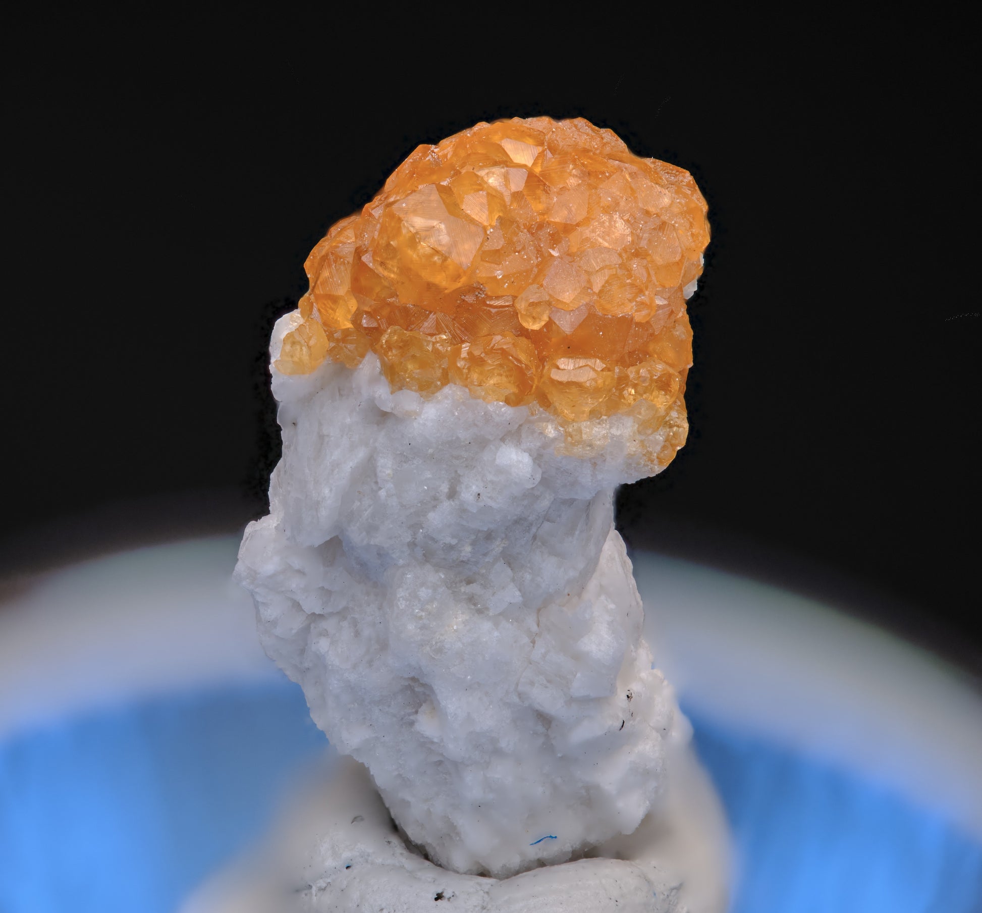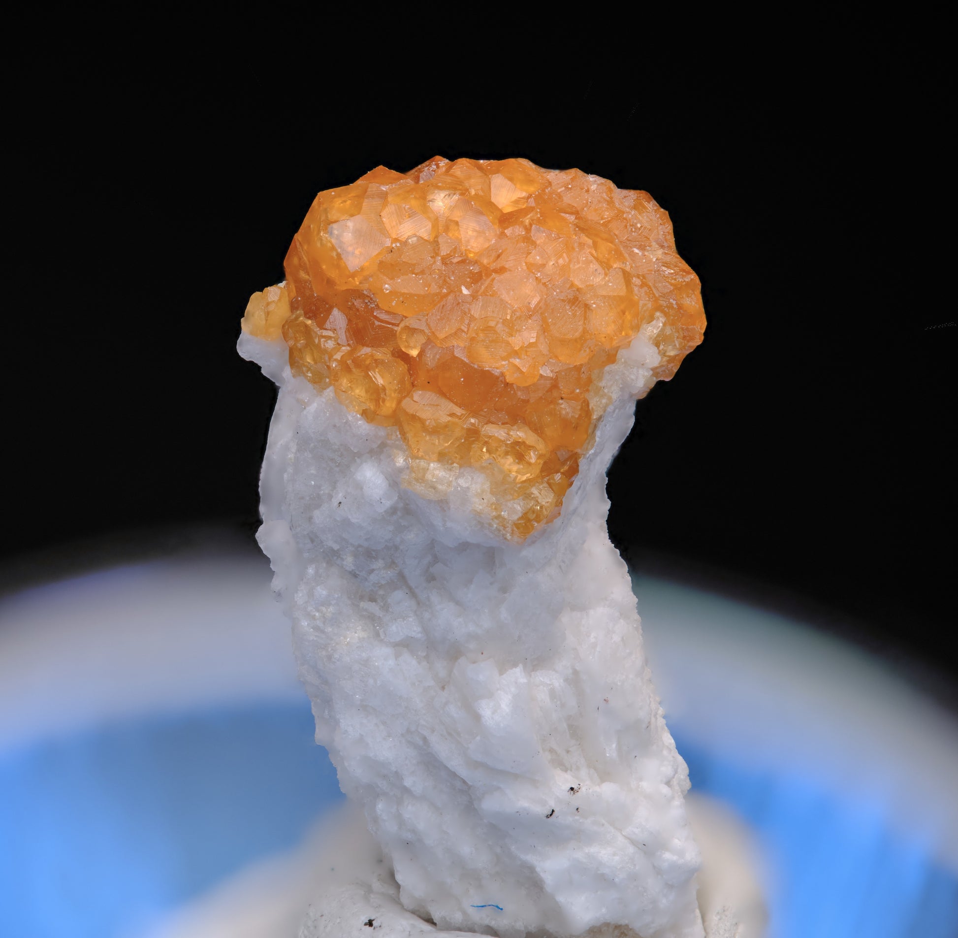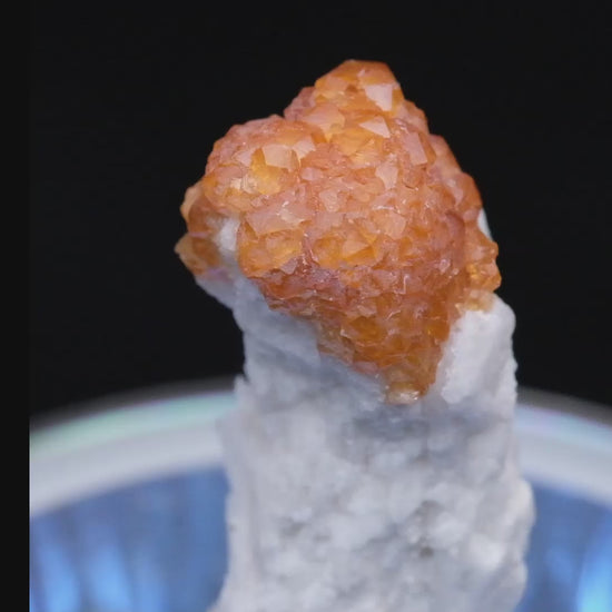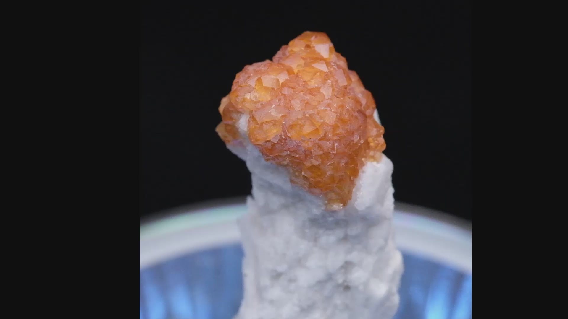 A striking pillar of snow-white quartz capped by a gemmy and lustrous, hot cinnamon-orange spessartine garnet cluster from the famous Tongbei granitic complex. The glittering garnets form a complete all-around cap. As shown in the 360-degree rotation of the photos and video. The quality, color, and transparency of the spessartine crystals is a wonder to behold.