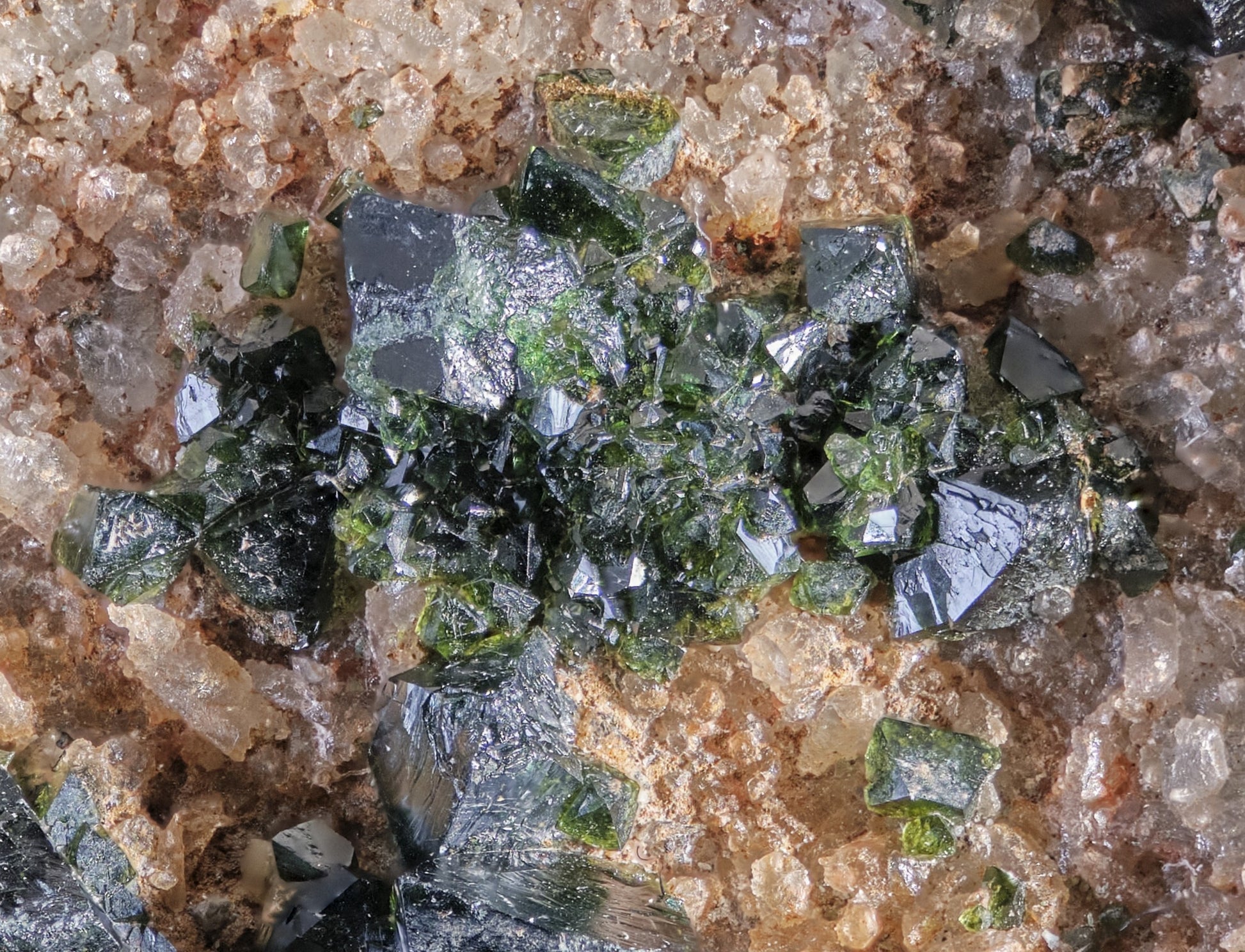 Libethenite is an attractive secondary copper phosphate mineral found in the oxidised zone of copper ore deposits. This self-standing specimen features dark Brunswick green to light Kelly green, wedge-shaped crystals of libethenite forming complex interpenetrations. It is associated with lovely, gemmy and translucent, aqua-blue spherical growths of what I infer to be chrysocolla (not analysed). Colorless to white “knobby” quartz crystals provide a lustrous, sparkly accompaniment. The Tilwezembe Mine is an obscure copper and cobalt occurrence in the DRC. There are only three photos of Libethenite from this locality in the public archives of Mindat.