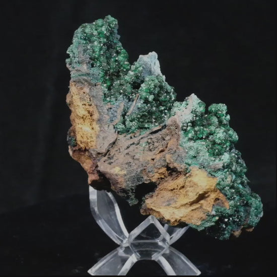 A very showy, sparkling, and strikingly three-dimensional small cabinet specimen of gemmy, lustrous libethenite with a nicely contrasting light brown limonite gossan. The Libethenite is complemented by powder blue Plancheite and lovely, sub-mm size botryoids of a translucent aqua-blue species, most likely pseudomalachite. This terrific specimen is self standing.