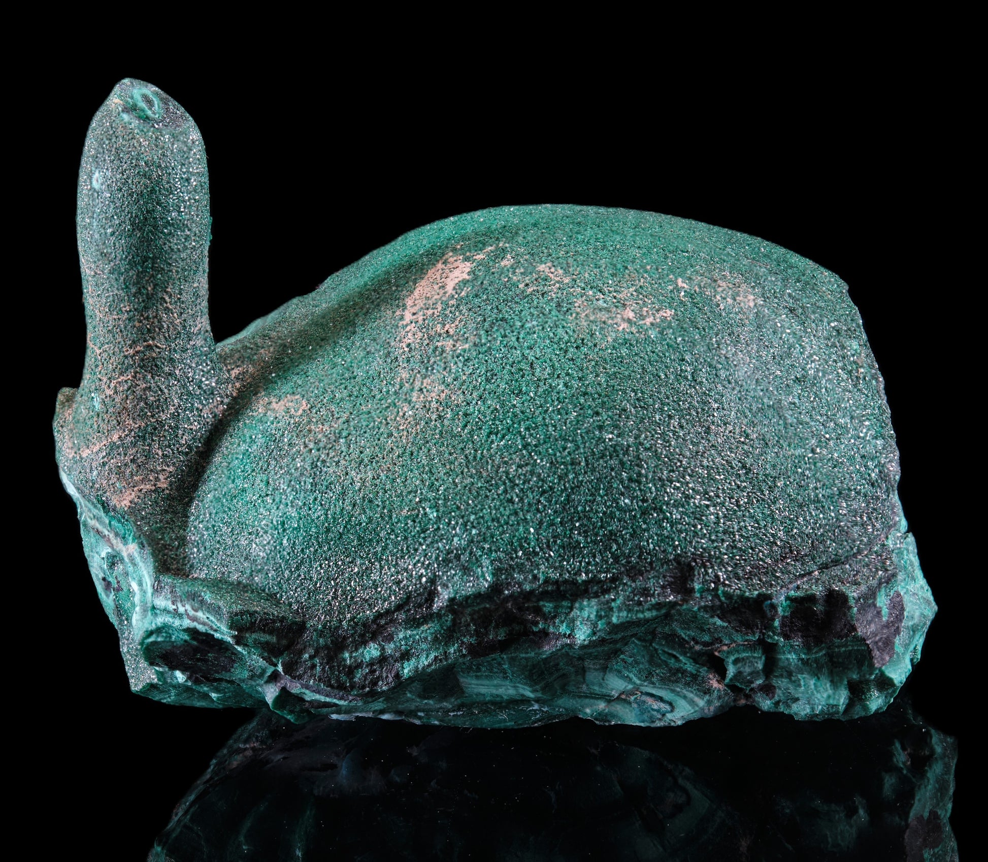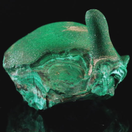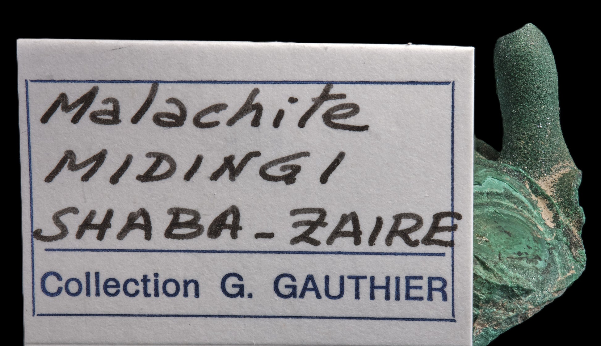 A hemisphere of sparkly, banded, brunswick-green malachite with one stalactite, acquired from the great Belgian mining engineer and mineral collector Gilbert Gauthier, with label.