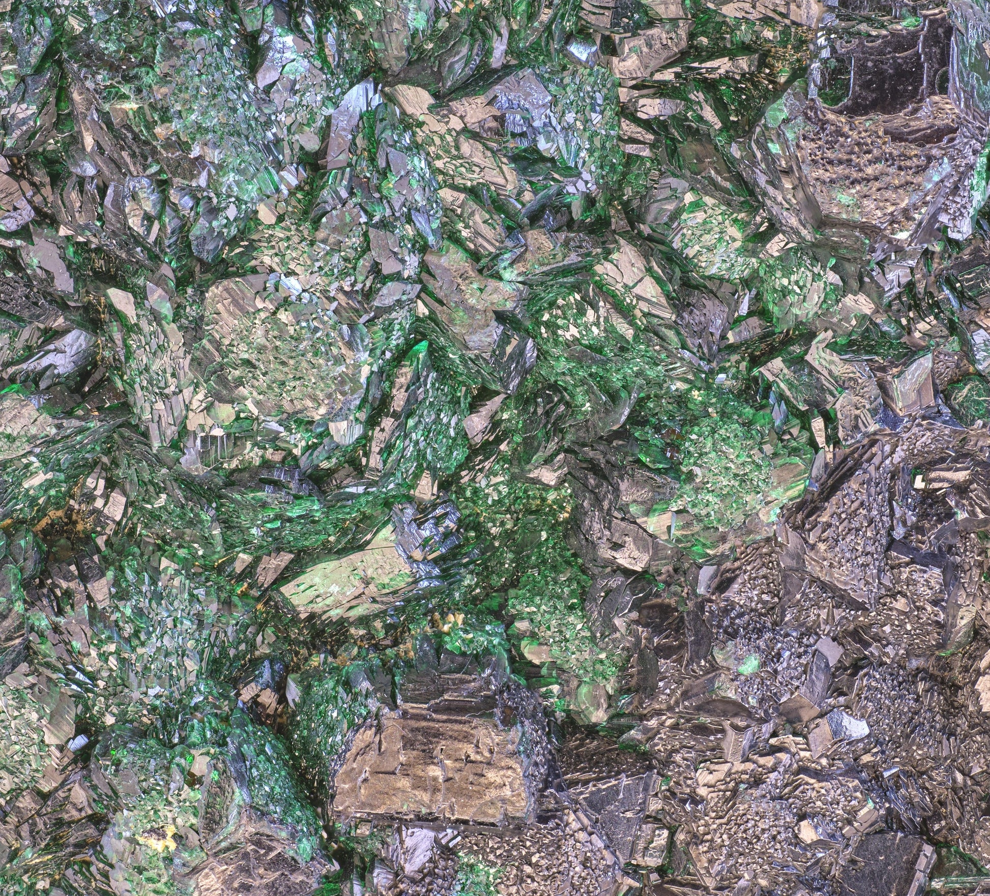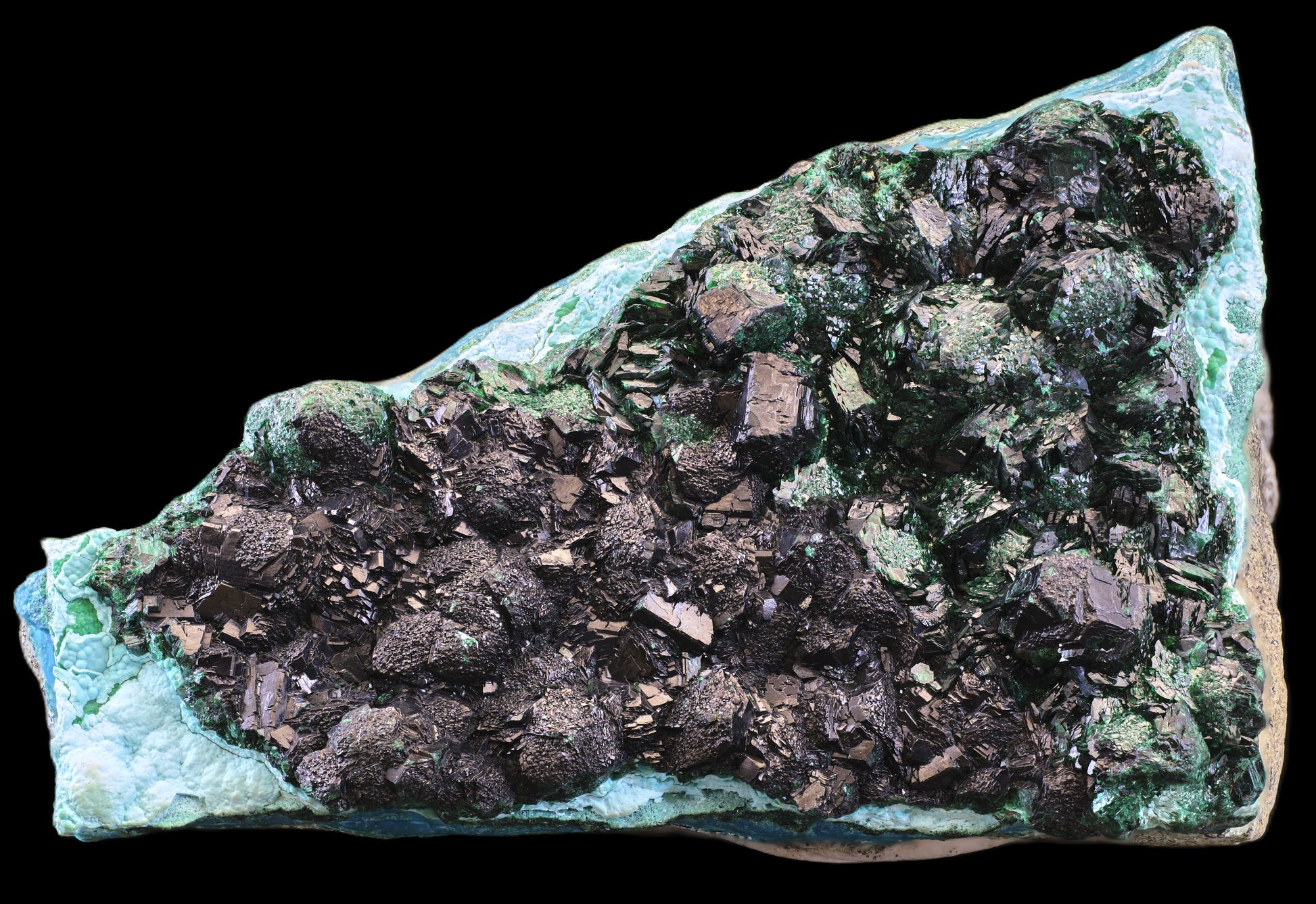 Cross-sectional details include complex botryoidal structures with central kernels of chalcocite, around which radial-stellate structures have formed (plancheite?), yielding to an outer ring of chatoyant, primary malachite. The malachite in cross-section presents sublime rainbow diffraction patterns. Note how remnant grains of sedimentary sandstone host rock have been cemented within the banded chrysocolla.