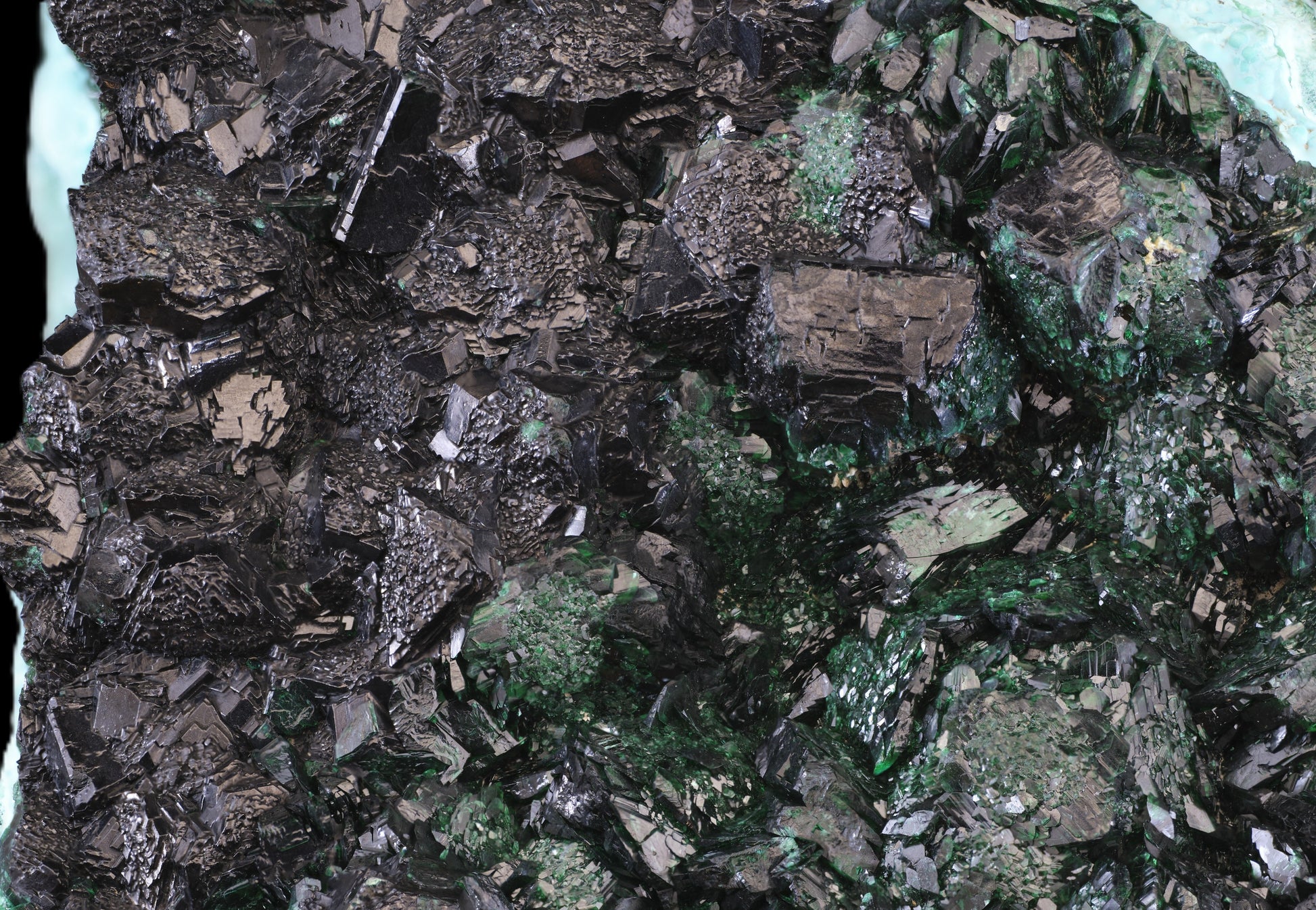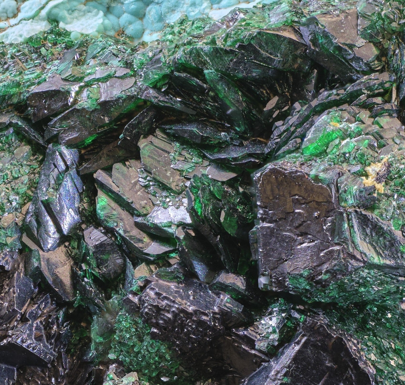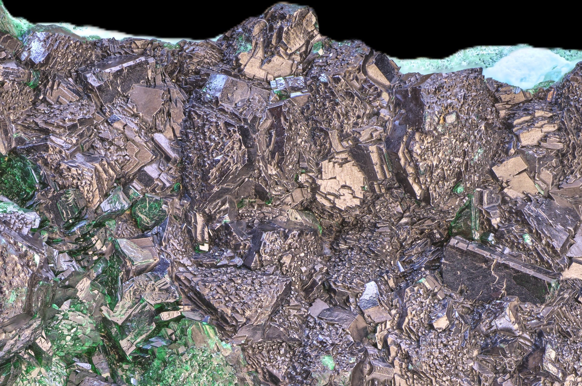 The self-standing specimen is noteworthy for its broad array of very sharp, distinct crystalline structures, including (1) the primary forms of malachite documented by Goldschmidt (1913-1926), (2) both cubic and truncated octahedral Ps. after cuprite, and (3) botryoidal forms visible in cross section. Superb composite features are observed, such as radial growth patterns of primary malachite “children” around a “parent” compound crystal.