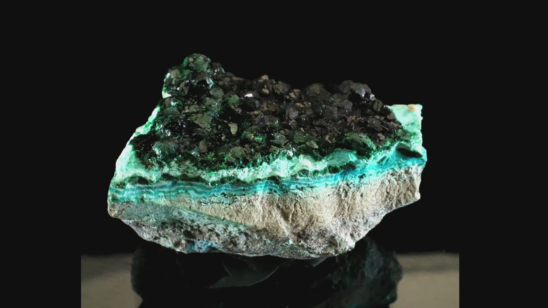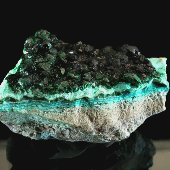 Specimens from the Kambove Principal Mine are recognized as a highly sought-after occurrence for rare, primary malachite. This fascinating and unique miniature presents primary, translucent, emerald-green malachite crystals intergrown with pseudomorphs after cuprite. Some areas are coated with a thin veneer of a darker vitreous species, likely heterogenite. The malachite rests on a bed of beautifully banded, light to sky blue chrysocolla. The chrysocolla is of two varieties, a powdery blue form and a sky-blue species with adamantine luster, suggestive of the gel variety.