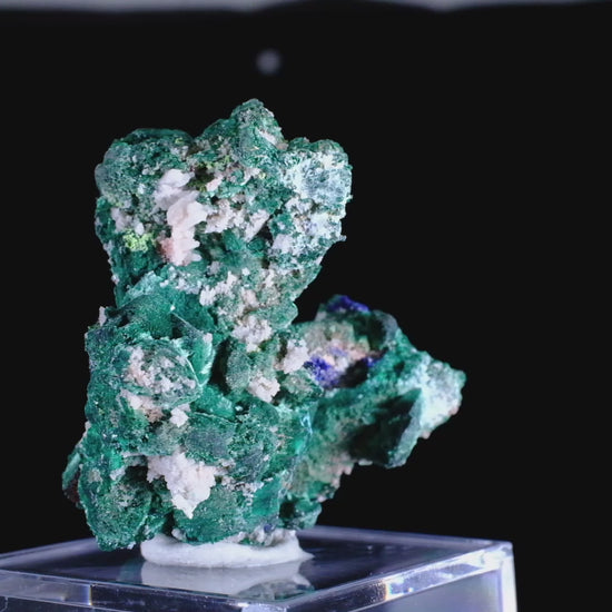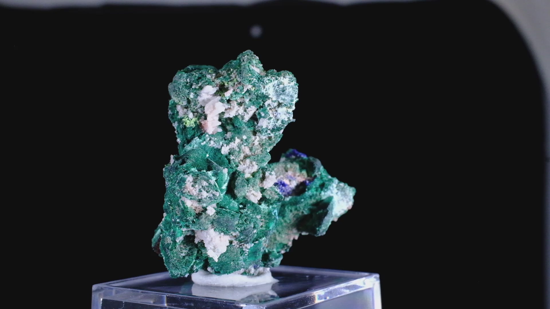 Velvety, brunswick-green, chatoyant acicular malachite crystals after azurite are complemented by royal blue azurite and nicely contrasting quartz with calcite. The chatoyant effect is due to the radial, fibrous structure of the malachite, as shown in the photographs. Tentatively identified ancillary species include cryptocrystalline red cuprite, yellow-green Bayledonite (likely pseudomorphed after another mineral), and colorless, acicular “jackstraw” cerussite (none analyzed). This remarkable specimen is classic Tsumeb material, likely sourced from the upper oxidized zone. It was acquired from noted Tsumeb collector and dealer Clive Queit during the go-go days of the 1980s and has remained uncirculated since that time.