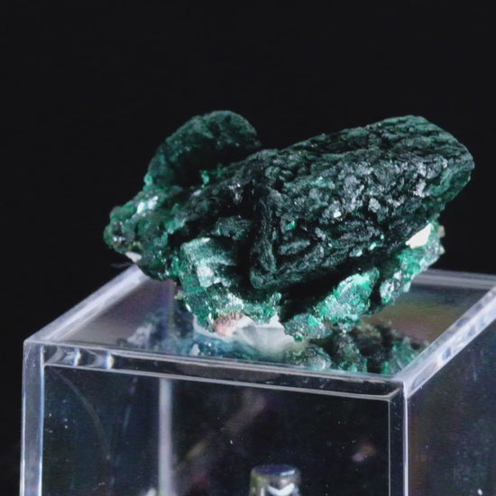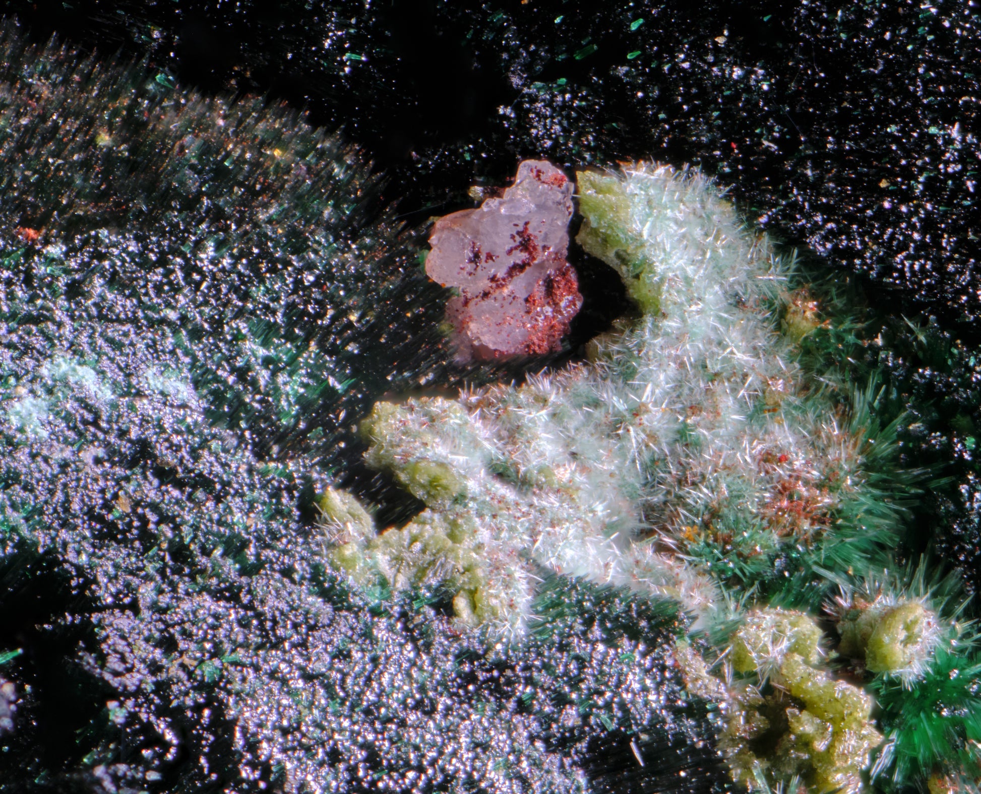 Interpenetrating crystals of velvety, brunswick-green malachite shimmer in the play of light on this specimen. The chatoyant effect is due to the radial, fibrous structure of the malachite, as shown in the photographs. Yellow-orange wulfenite casts add wonderful contrast and present a relict cubic structure, potentially due to cuprite replacement. Close examination reveals one 8-mm wulfenite crystal completely overgrown by chatoyant malachite with minor accessory duftite and an acicular white mineral, possibly cerussite or dundasite (not analyzed). Macrophotography shows cryptocrystalline red cuprite sprinkled in the mix. This remarkable specimen is classic Tsumeb material, likely sourced from the upper oxidized zone. It was acquired from noted Tsumeb collector and dealer Clive Queit during the go-go days of the 1980s and has remained uncirculated since that time.