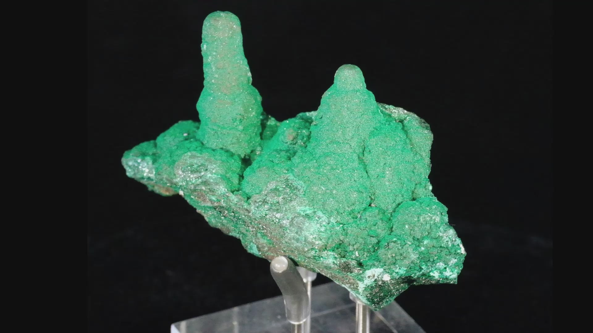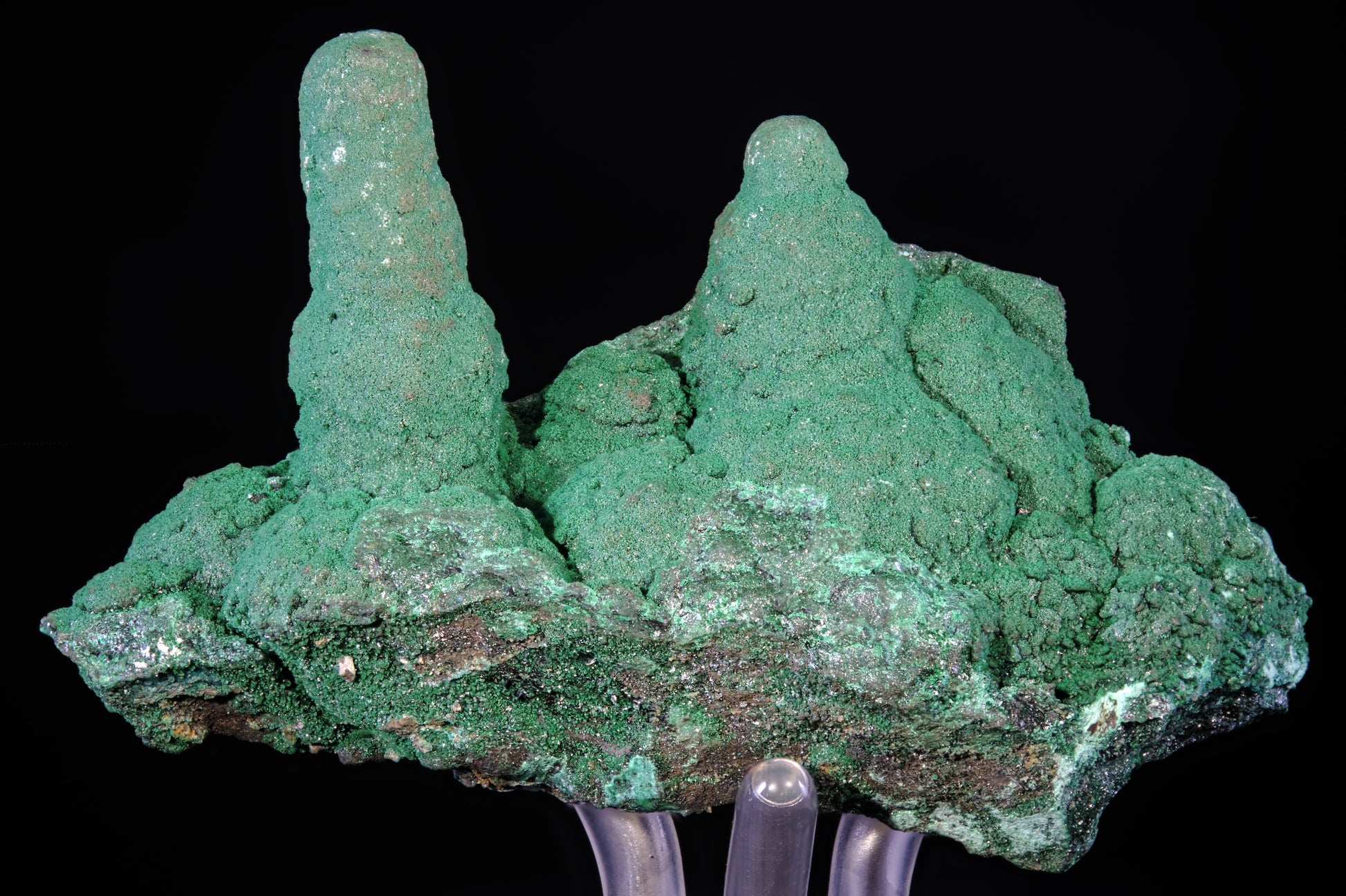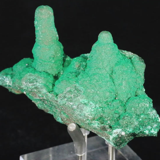 The Lukini Mine, now long closed, is recognized as the source of some spectacular secondary copper specimens. Only 25 pieces are posted in the public archives of Mindat, of which one is stalachtitic malachite. This classic specimen features two Brunswick-green stalactites that have grown together over eons of diagenesis. The specimen exhibits a sparkling velvety luster, making for an attractive display piece from this lesser-known locality.