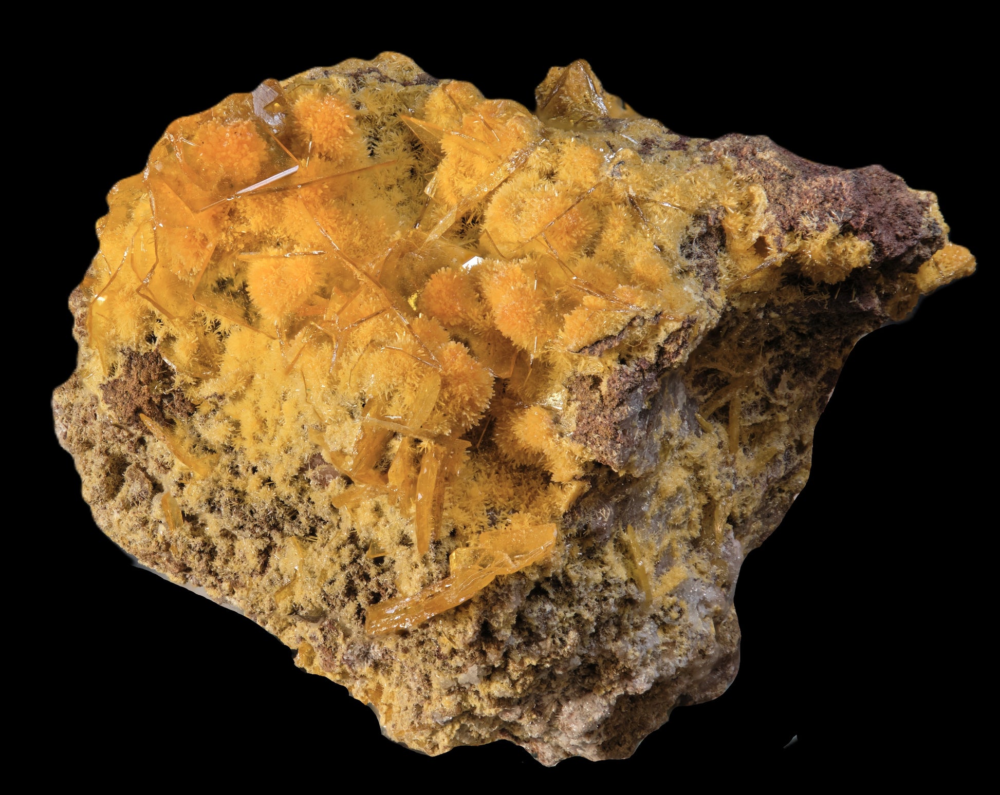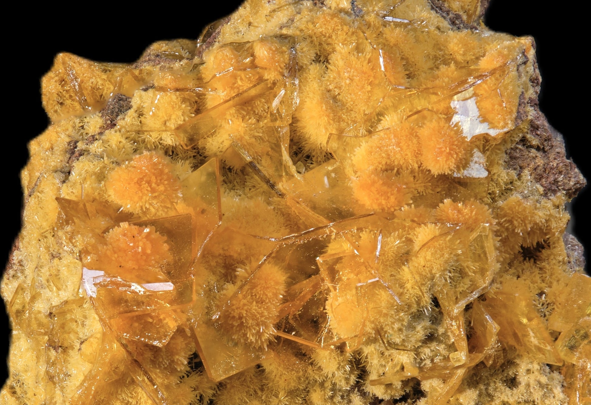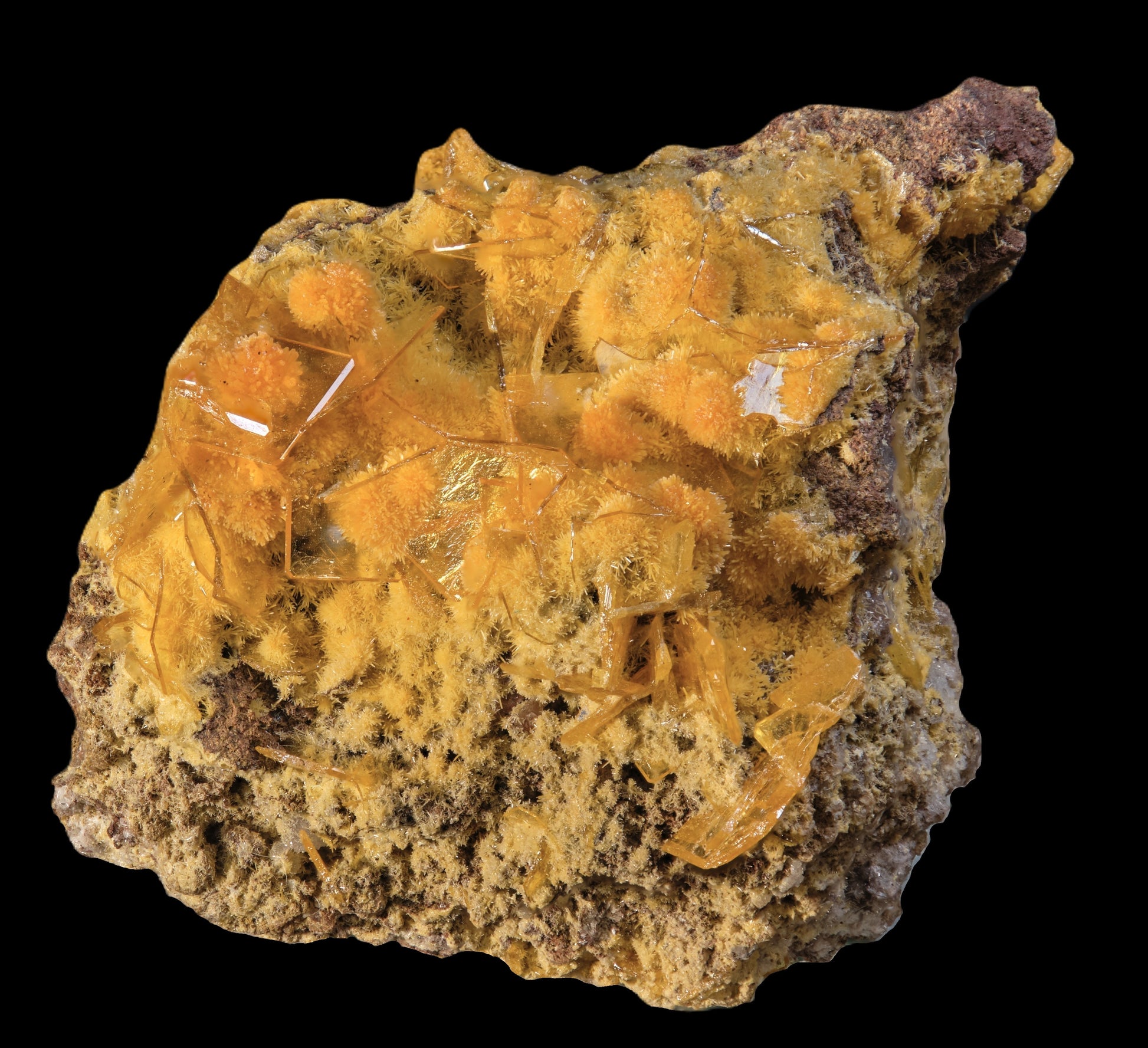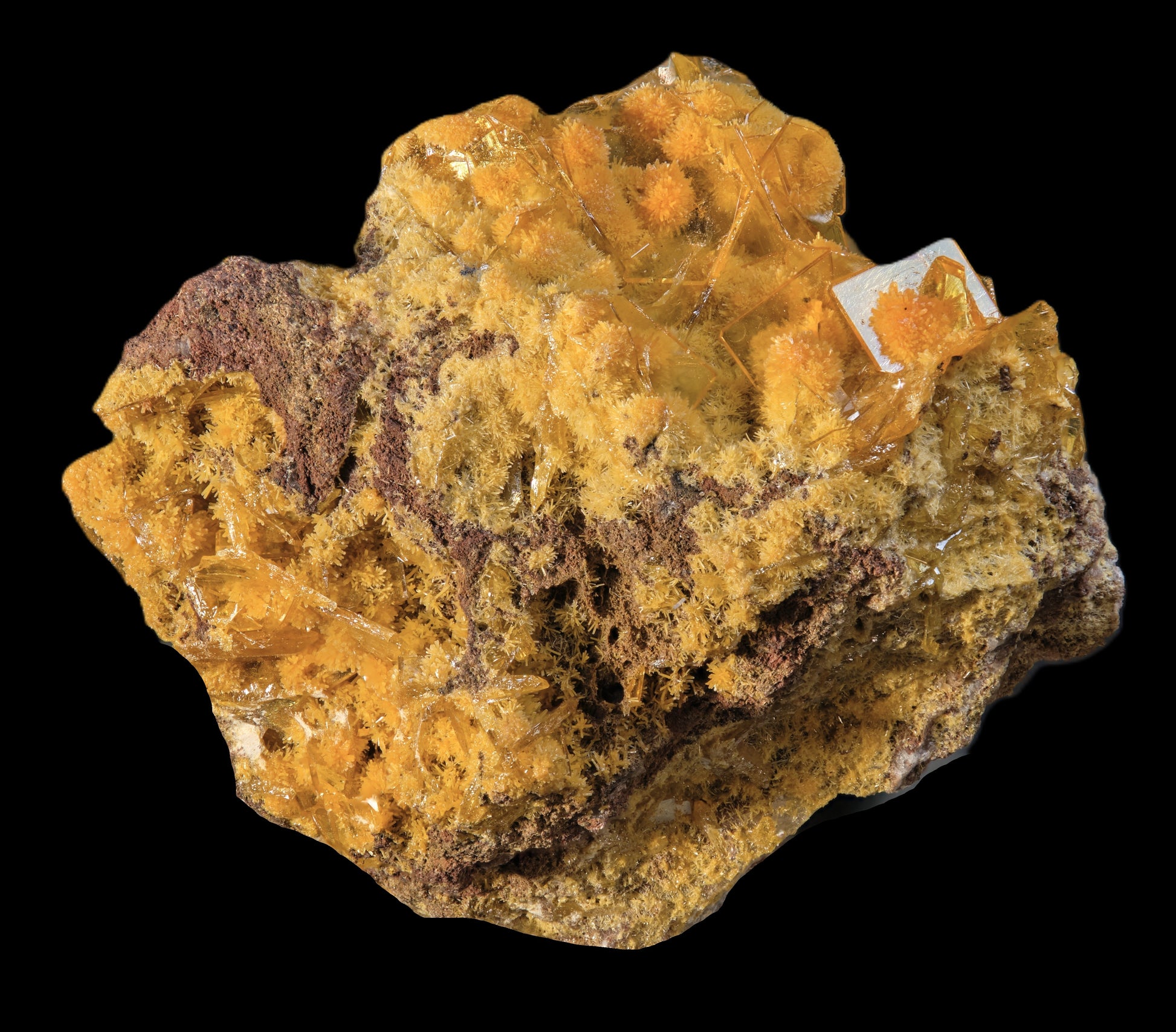 A stunning and mesmerizing thumbnail of orange, gemmy “windowpane” wulfenite crystals in association with acicular, prismatic “starbursts” of orange-yellow mimetite. The mimetites appear on, within, and behind the transparent wulfenite panes, to fascinating effect. Amazingly, some of the wulfenite crystals are still completely intact. From a forty-year-old, uncirculated collection.