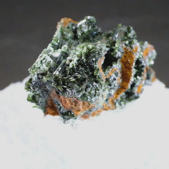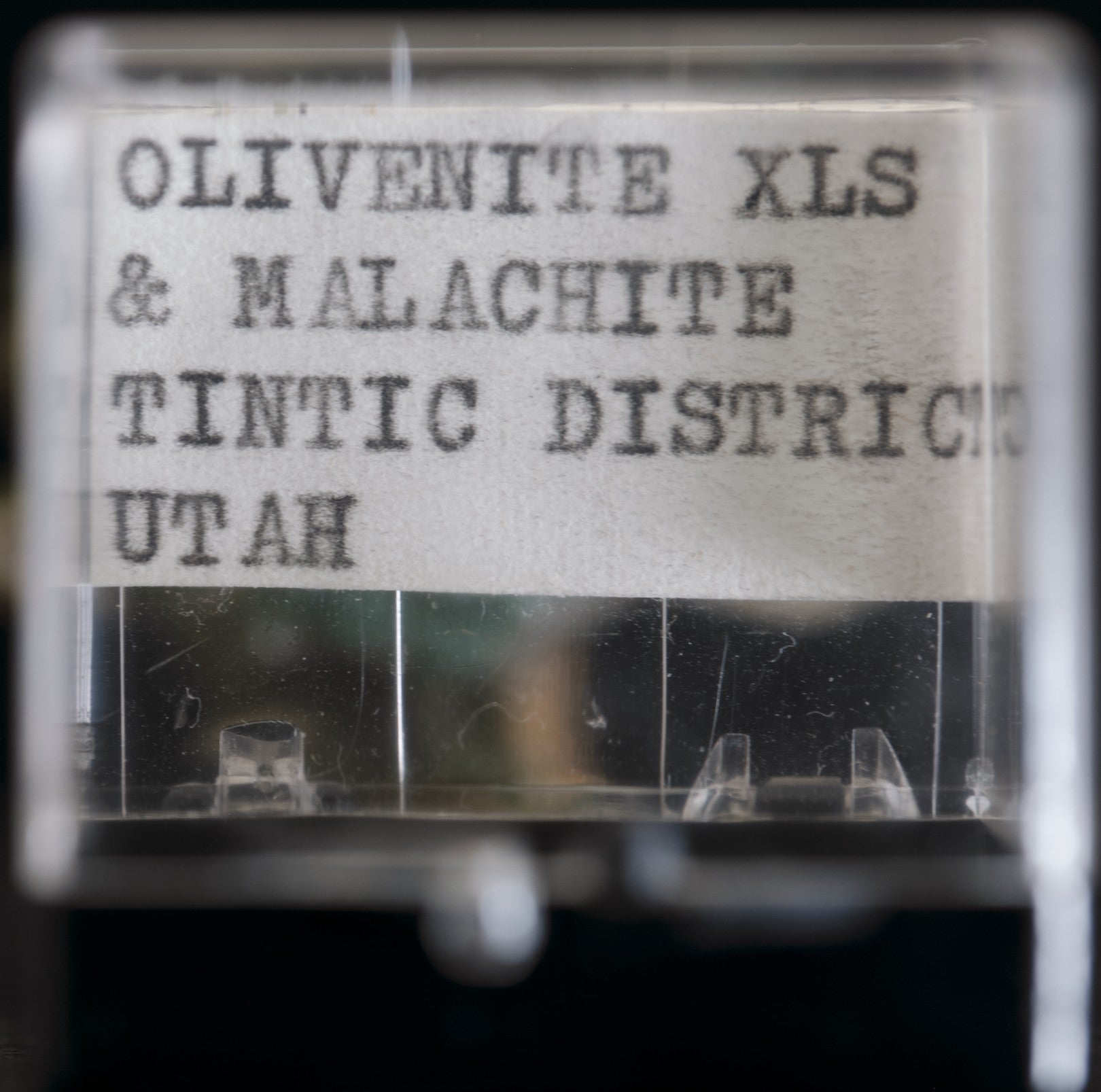 This TN presents deep green, gemmy olivenite from the historic Tintic District of Utah. It’s definitely an old timer, judging from the yellowing typewritten label. The sparkly olivenite contrasts beautifully with the goethite gossan. Close up, the olivenite shows textbook, translucent, lustrous, radiating lathes and aggregates. What I especially like about this specimen is the exquisitely crystallized vugs: one featuring fibrous, botryoidal malachite, the other a lime-green unknown which I believe to be Cornwallite (not tested). To top it all off, the olivenite is generously capped by spherulitic aggregates and reniform crusts of a creamy white, microcrystalline unknown which strongly resembles Arsenocrandallite from the Centennial Eureka Mine of the Tintic Mining District (Mindat ID 5PH-91N).