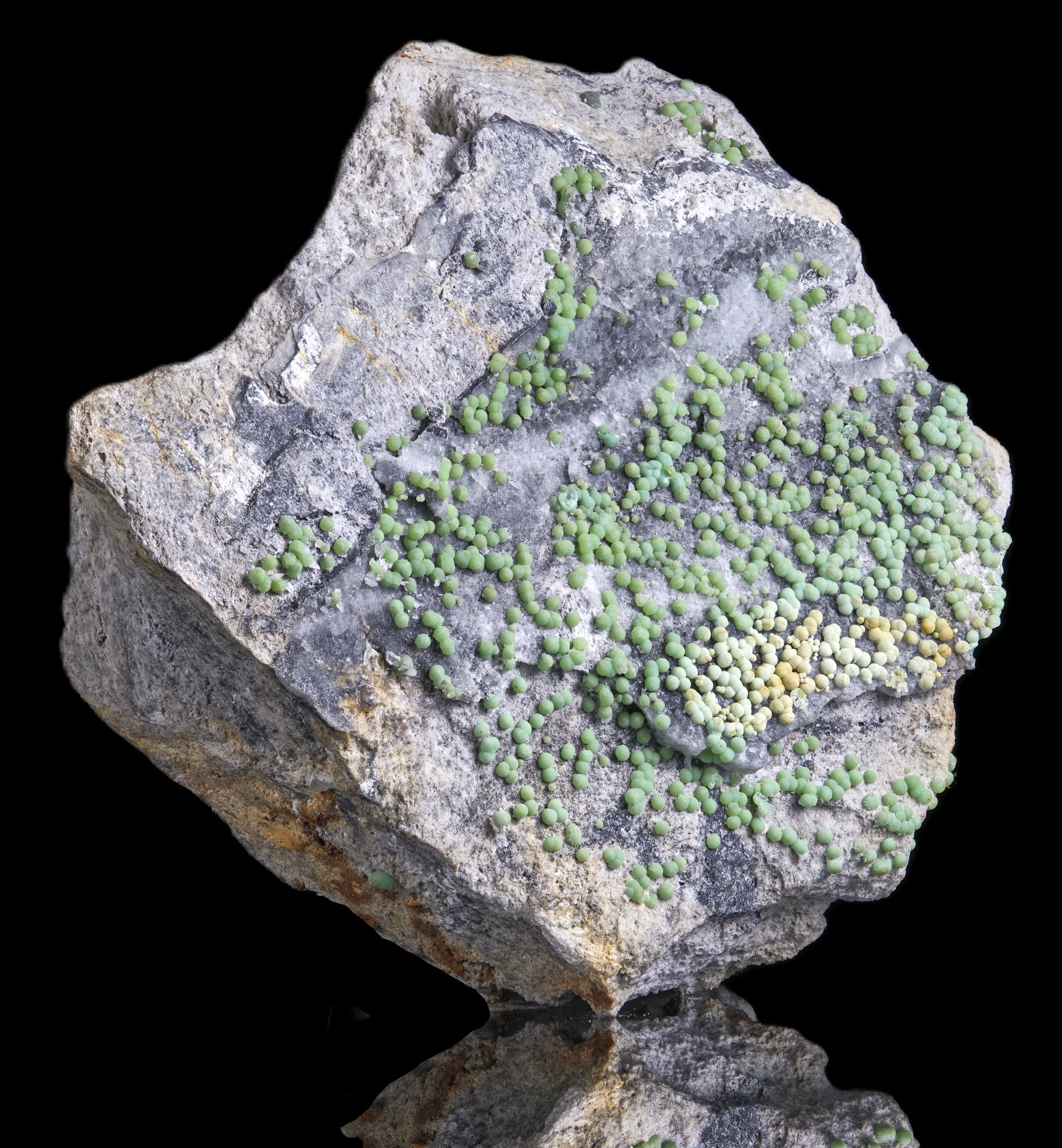 Sublime, mm-scale, blue-green to light yellow-orange botryoids of the aluminum phosphate, Planerite, grace a light grey, fine-grained pure quartzite/chert of the Ordovician Bigfork Chert formation. Planerite is a rare member of the Turquoise Group. Multihued specimens are comparatively uncommon.