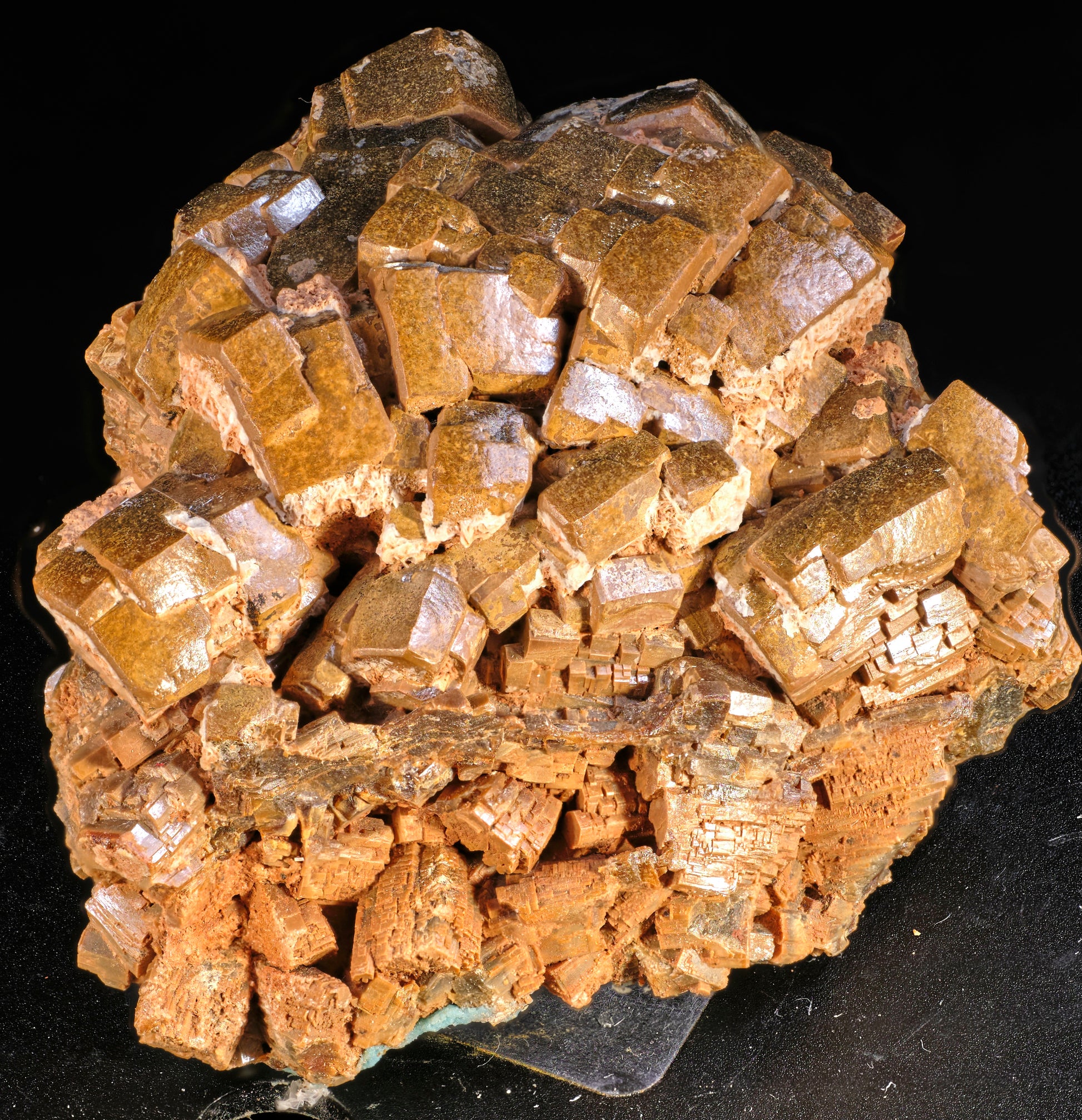 An unusual occurrence of pyromorphite from Mibladen, presenting large (up to 1 cm), tan-brown, barrel shaped hexagonal, prismatic, and stepped-tabular habits. Crystal faces are curved and display a lustrous, polished sheen. There is a minor association with a white tabular mineral, possibly barite or cerussite. “Curiously, Morocco, a country so rich in secondary lead minerals, to date has very few localities for Pyromorphite.” (Fabre Mineral Museum).