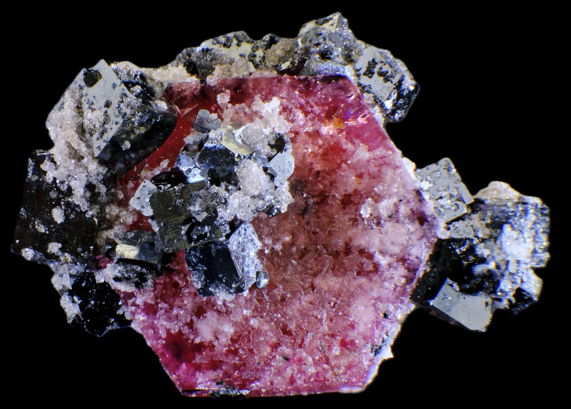 A superb, pinot-red translucent beryl crystal embedded with lustrous, jet black bixbyite. The bixbyite presents complex interpenetrations and is encrusted with sparkling, drusy quartz. Minute ghost crystals of topaz can be observed within the beryl under magnification. The beryl is complete all around but for one bid nip. Images have been backlit to highlight internal structure and translucency. This piece, along with a vanishingly few others, was extracted from a pocket on October 4th, 2024, by miners. The specimen comes with a certificate of authenticity.