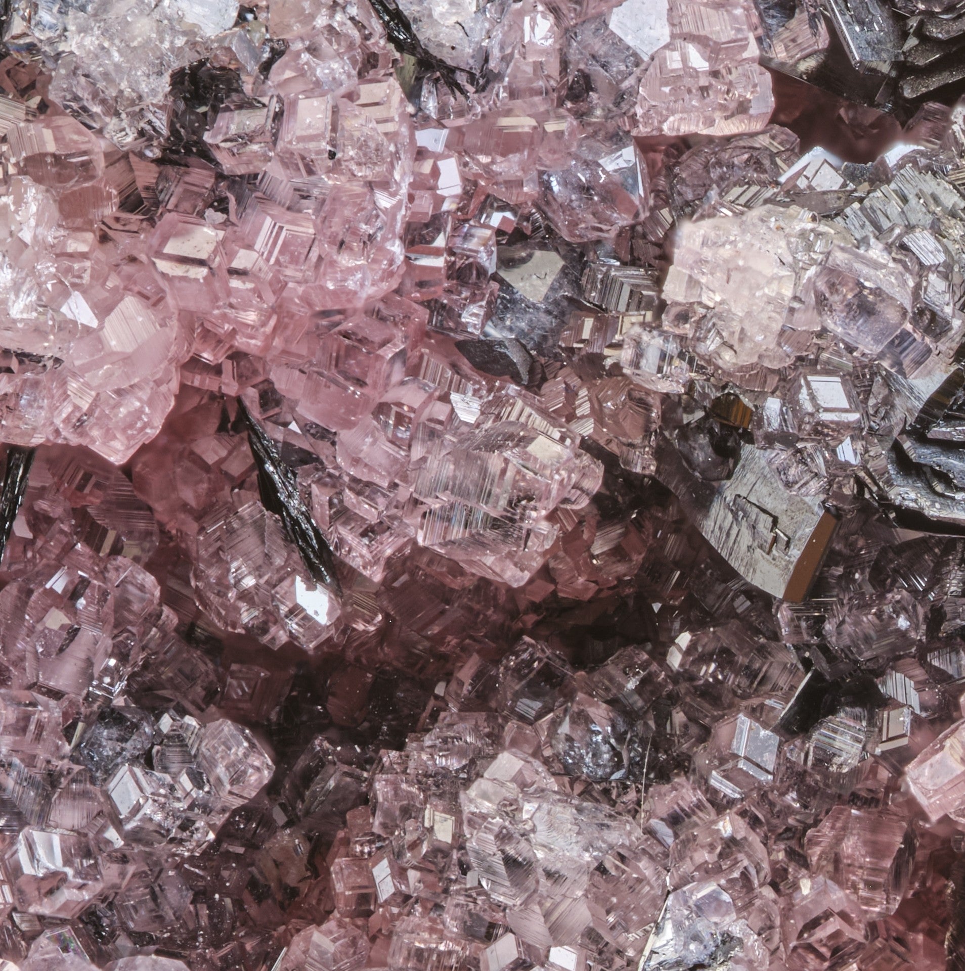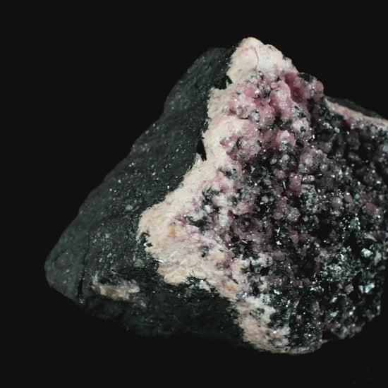 This brilliant, sparkling, small cabinet specimen presents the iconic pairing of gemmy and transparent rose-pink rhodochrosite on crystallized manganite, set on a base of massive manganite ore. The rhodochrosite crystals present magnificently stepped and striated rhombohedra under magnification, along with occasional cryptocrystalline, cochineal-red scalenohedra. Minor quartz mineralization is also present. This unusual find was sourced directly from the notable South African collector Clive Queit almost forty years ago, during the heyday of the early 1980s, and has been in a private collection ever since. The N’Chwaning rhodochrosite deposits are considered world-class and were quickly exhausted. They are highly sought after by discerning collectors. Self-standing.