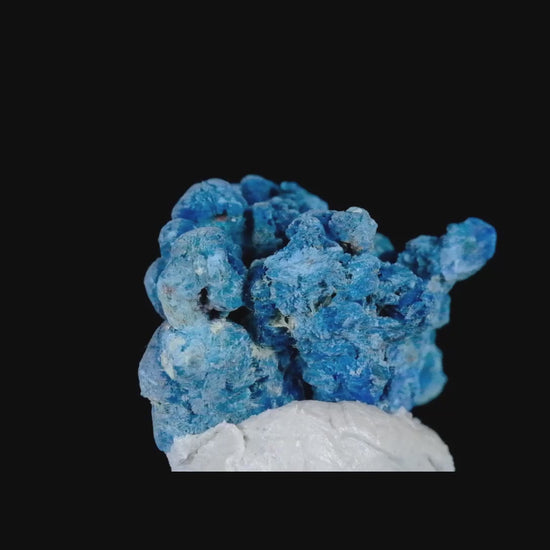 A beautiful thumbnail featuring spherulitic aggregates comprised of acicular and fibrous, light to dark blue Shattuckite crystals with a silky lustre. The white mineral is most likely Plancheite. The El Jacolito Mine is a fairly recent find (2019-2020), approximately 20 km east of the Milpillas Mine, on a privately owned ranch.