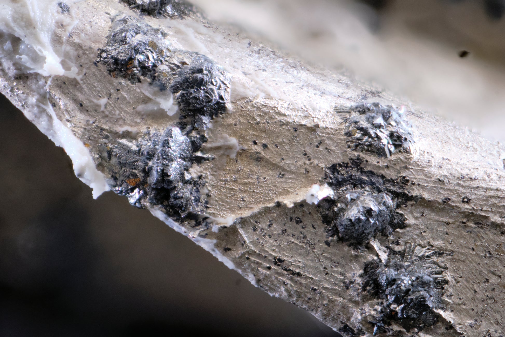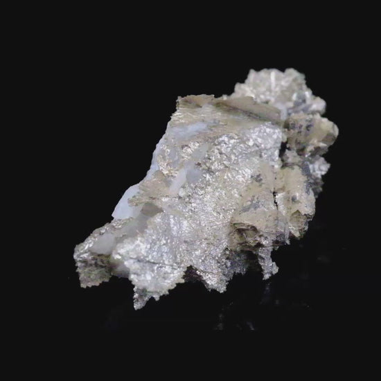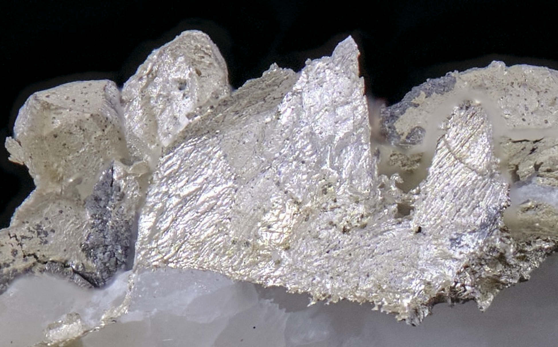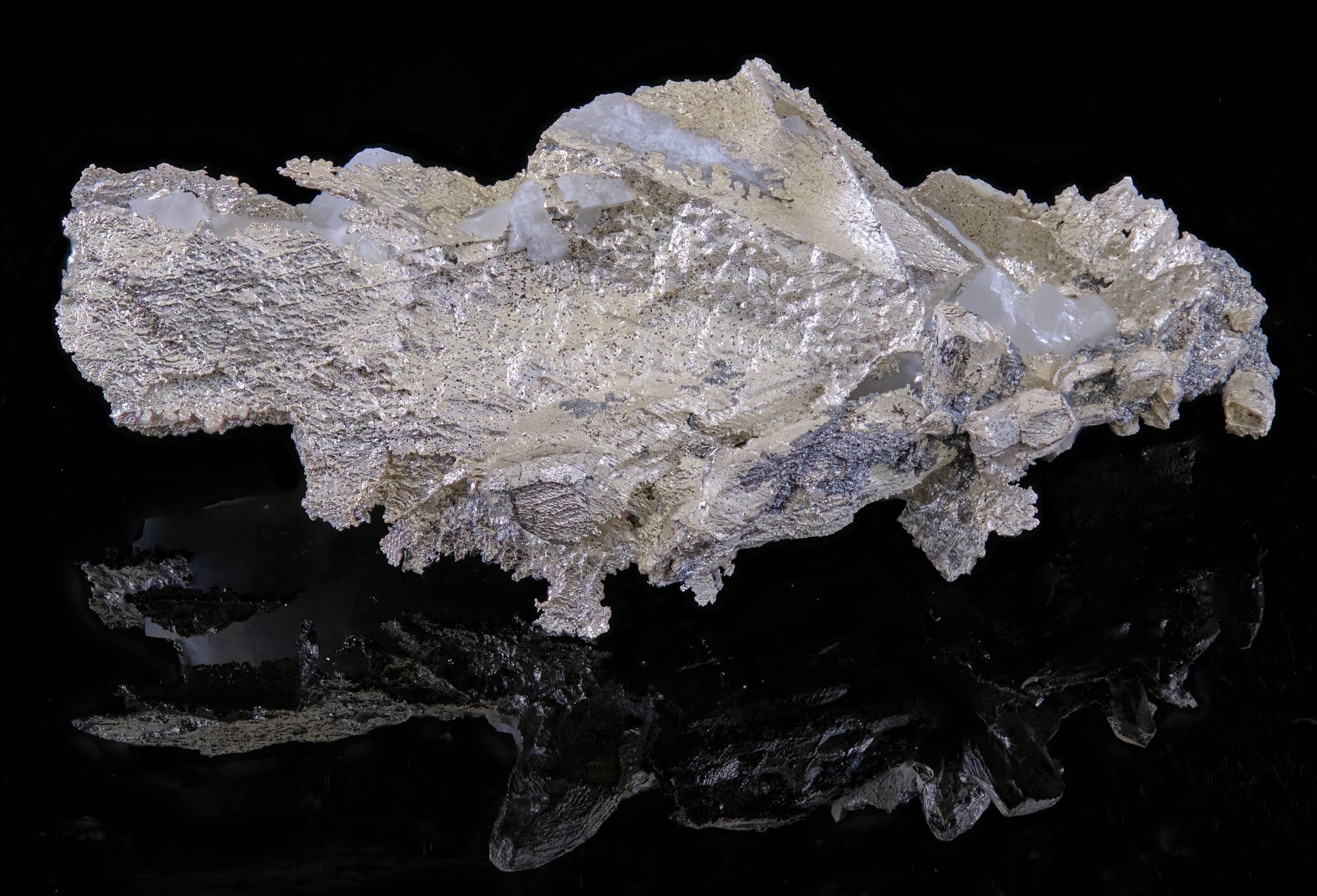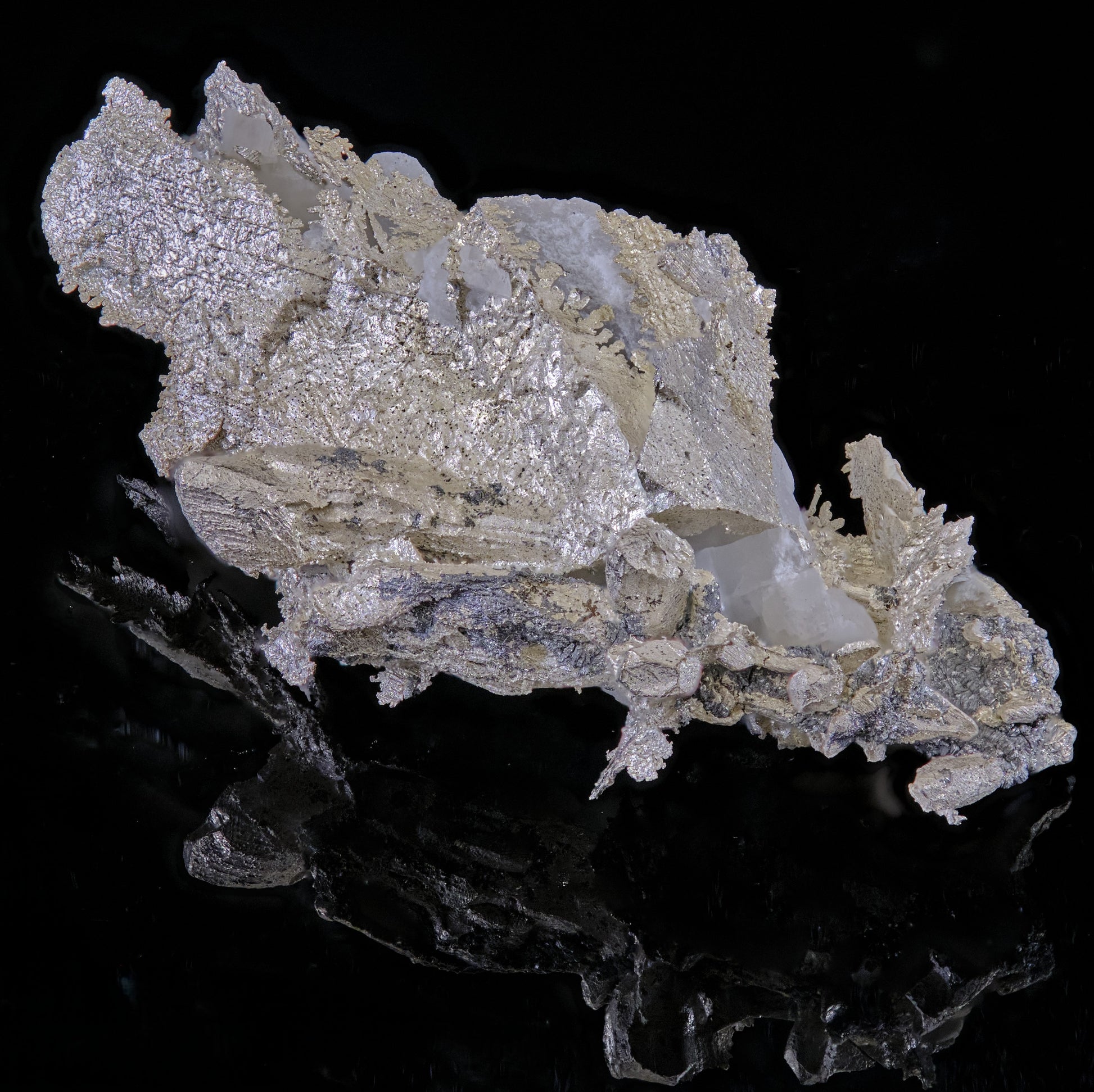 An exceptionally aesthetic, three-centimeter-long specimen of leaf and arborescent silver on calcite from this esteemed Moroccan locale. It is a very sculptural and architectural piece, presenting some highly unusual textures, most likely owing to the calcite host that has been etched away. Interspersed through the leaf silver are microcrystalline grains of a microcrystalline dark unknown. This is a superb, one-of-a-kind specimen for the silver aficionado.