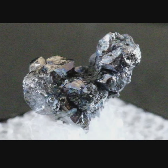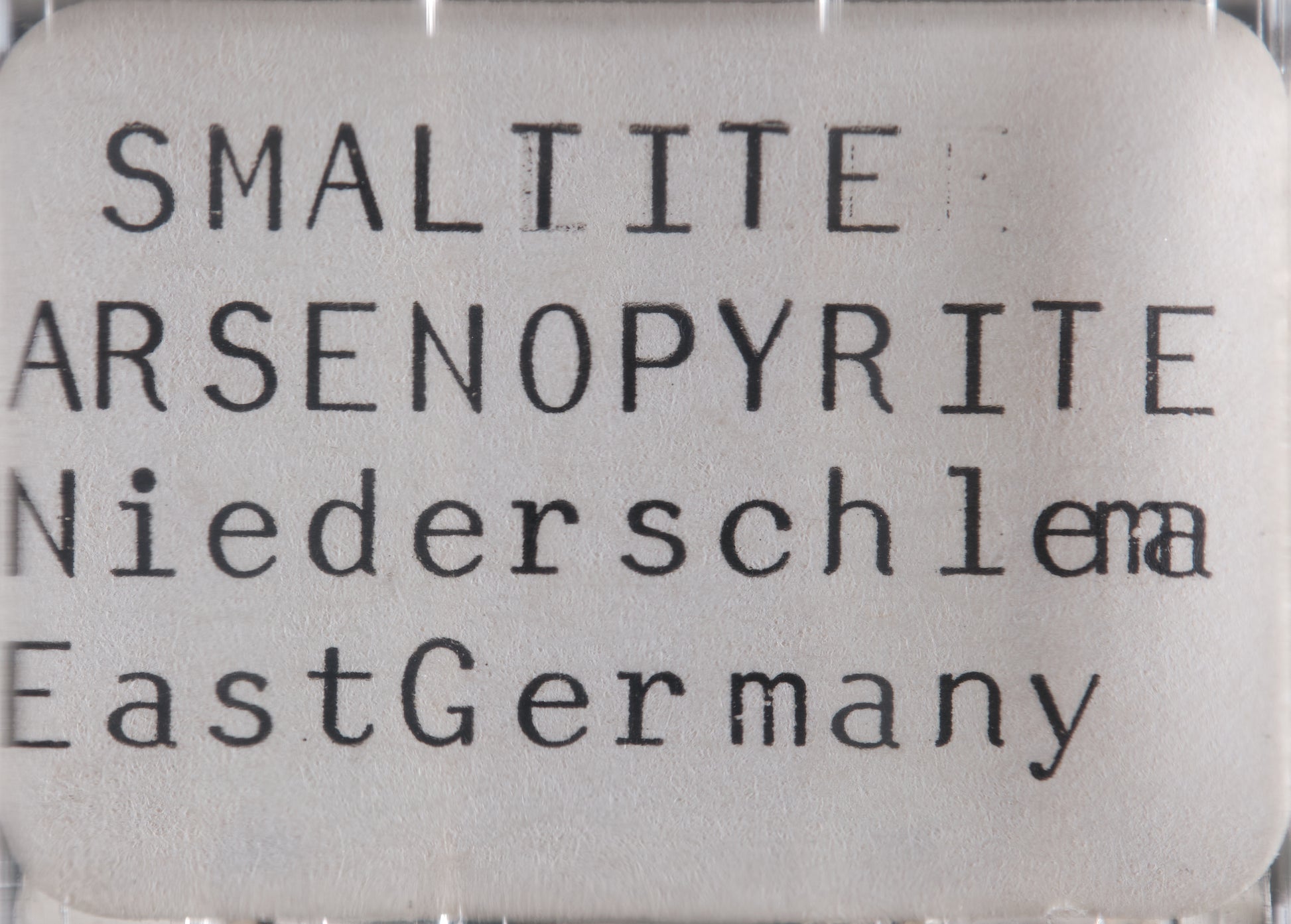 Smaltite is a variety of skutterudite, a rare mineral composed of cobalt and nickel arsenide. The species is historically significant as a source of cobalt for producing blue pigments like smalt, used in glass and porcelain. Originally considered to be a cobalt diarsenide, smaltite has been reclassified as an arsenic-deficient variety of skutterudite. It is quite rare worldwide. This specimen presents well-defined, metallic silver-grey, complexly interpenetrating cubo-octahedral masses with a sublime cobalt-blue sheen. I have also included close up photos of a secondary, matte-gray species, possibly smaltite-skutterudite as well, which – based upon relict morphology and habit - may be a pseudomorph after silver and/or a silver sulfide species, but this is conjecture (see, for example, Mindat specimen ID N38-9GU). This extremely rare specimen is sourced from the historically significant Schneeberg mining district, located in the Erzgebirgskreis region, Saxony, Germany, a mountainous area with numerous silver, cobalt and iron mines that have been mined since ancient times. The typewritten label likely dates from the 1970s.