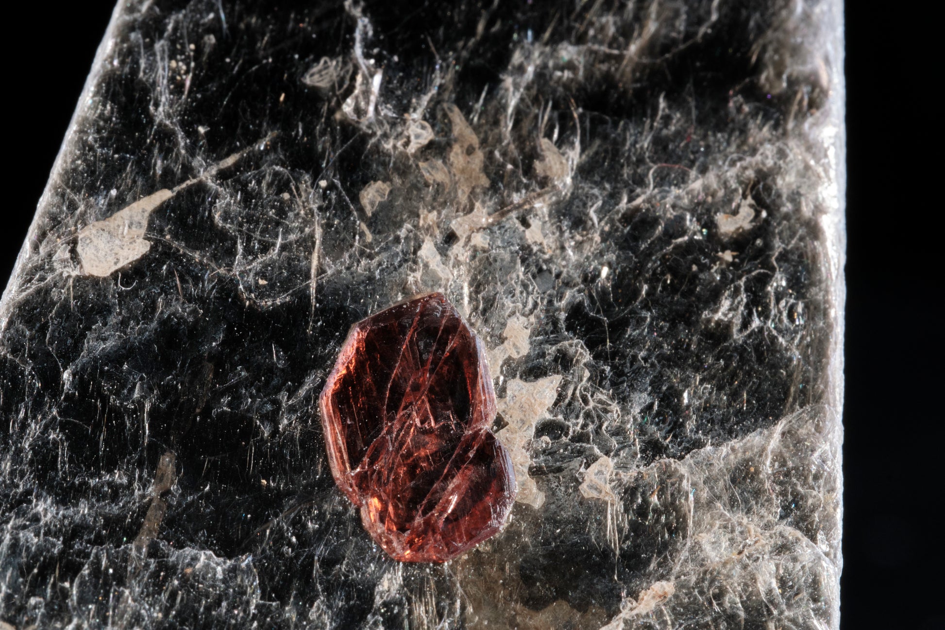 An eye-catching thumbnail of a gemmy, translucent orange-red spessartine crystal embedded in a thin sheet of highly lustrous, transparent muscovite from the Villeneuve mine in Quebec. Spessartine crystals in the muscovite are not common at this locality. Transparent crystals such as this one are even more rare.