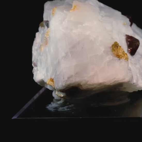 It has been nearly impossible to acquire fine quality Spinel specimens from Myanmar (formerly Burma) these days, let alone matrix specimens of Spinel. This piece hosts two classic Burmese "Ruby Spinel" crystals with very sharp, defined, lustrous, octahedral faces and a gemmy, rich purplish-red color, accented by a gemmy, honey-beige phlogopite association. The crystals sit atop a matrix of massive white marble as is typical for this locality. This is an example of a non-pegmatite gem mineral for which many collectors will want to have a good specimen.