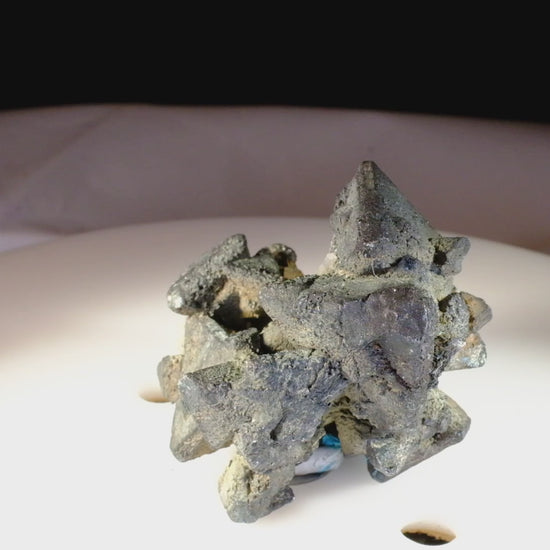 A sculptural cluster of ten or so black to dark gray interpenetrating Tennantite crystals with tetrahedron crystals up to 2 cm long on edge. The pyramidal crystals are well-formed (uncommon for Tsumeb), presenting textbook habit. There is some clipping evident on the underside (non-presentation side) of the piece; however, it does not distract from the aspect afforded by this self-standing specimen. Minor quartz association. Acquired from Clive Queit in the mid-1980s. Good, well-formed tennantite clusters are not common on the market.