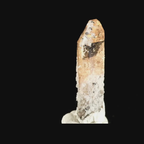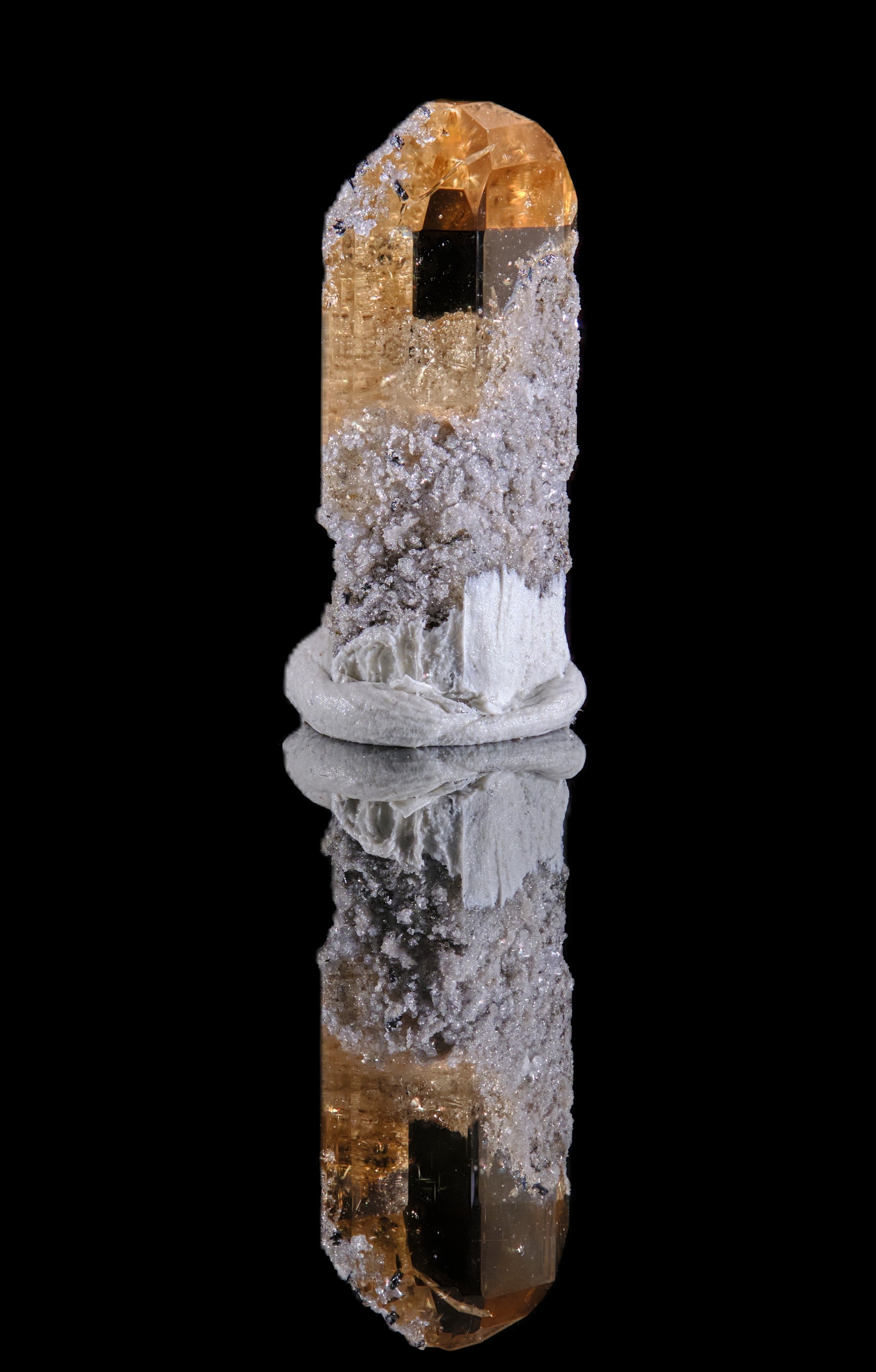 A super gemmy, exceptionally well crystallized topaz featuring a textbook termination with flashing, glass-smooth faces, and water-clear transparency, ending in a basal prism encrusted with sparkling microcrystalline druse. This piece glows from internal refractions with direct lighting.