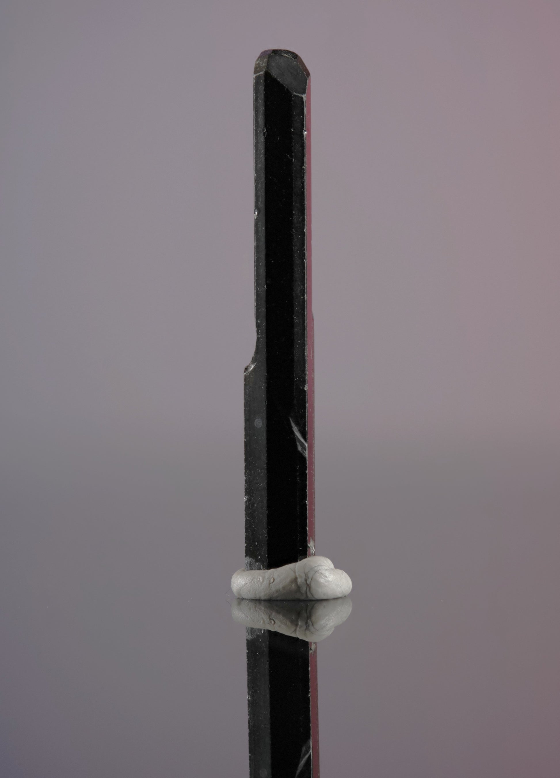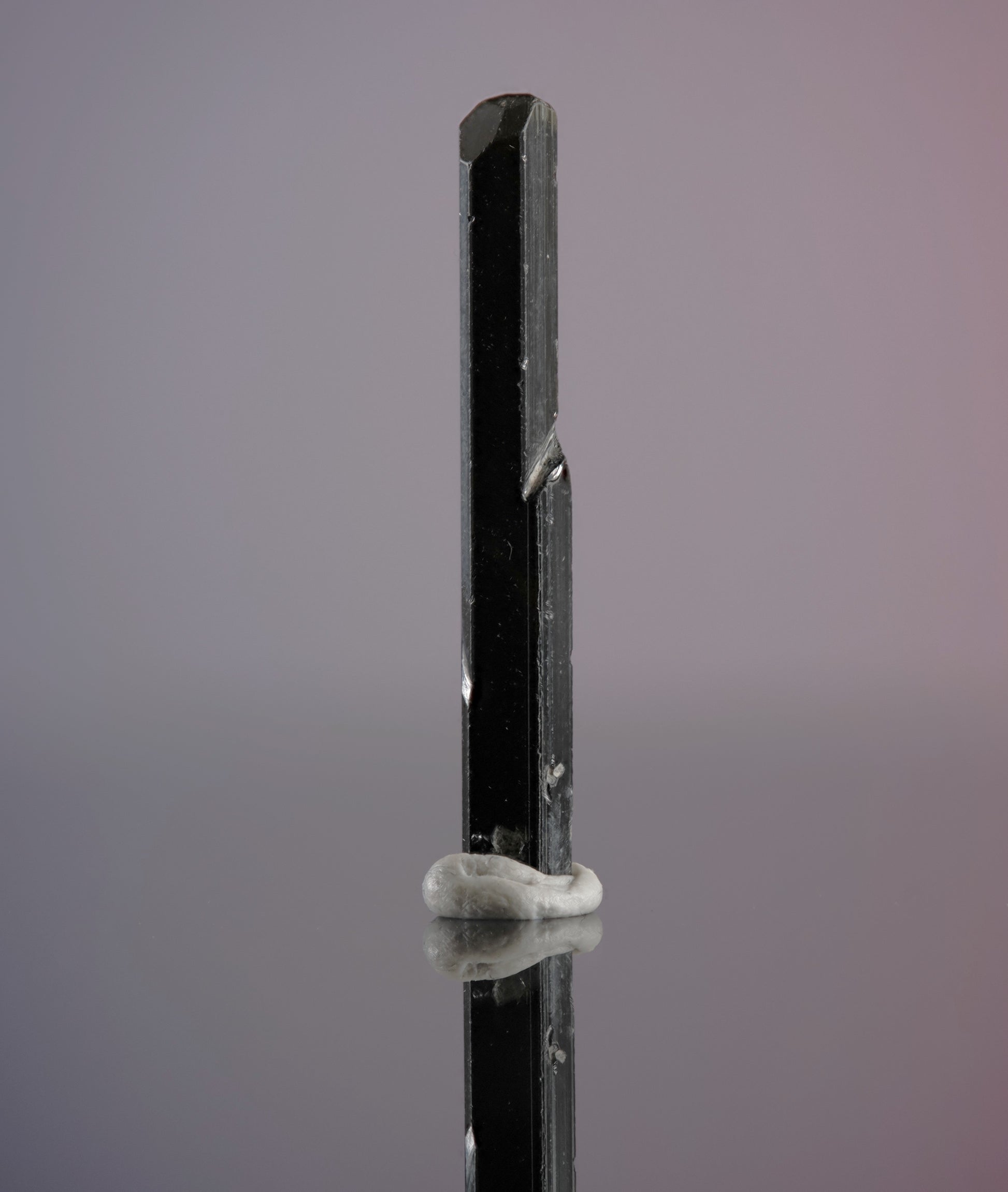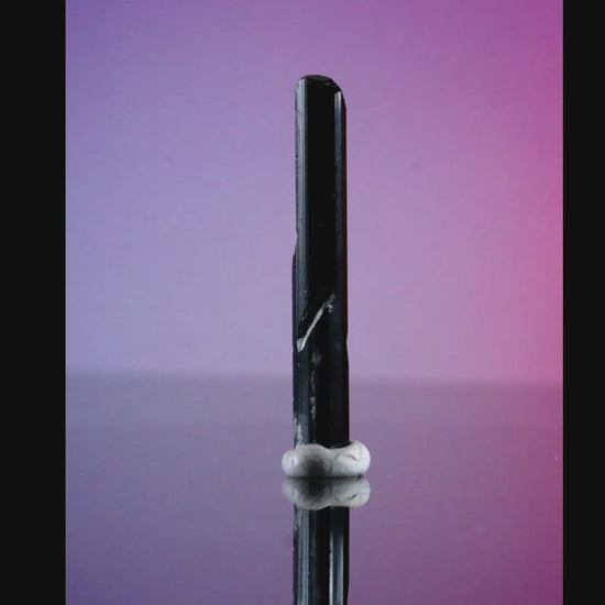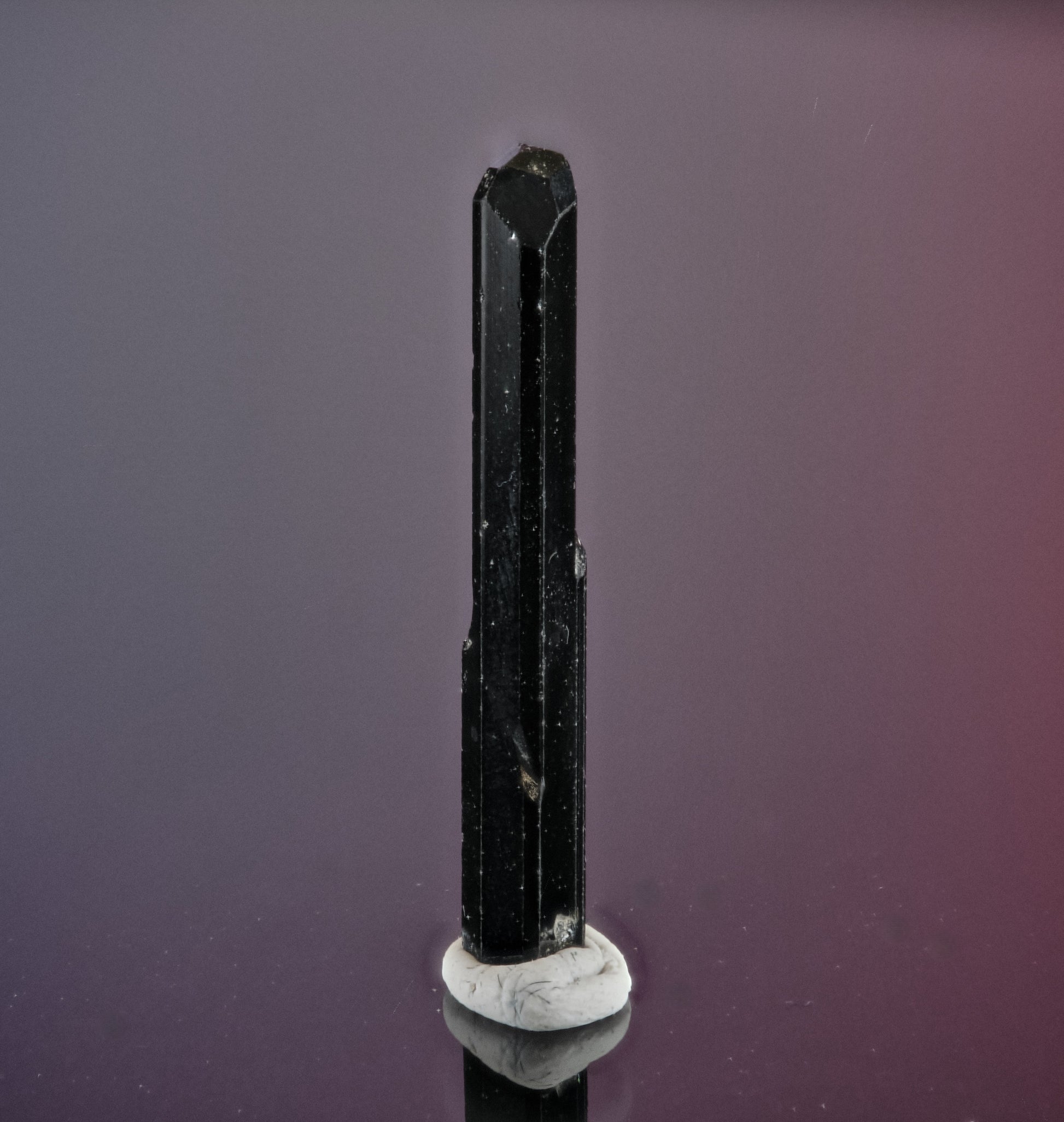 A jet black, lustrous, well-striated trigonal crystal with well-preserved modified pyramidal termination.