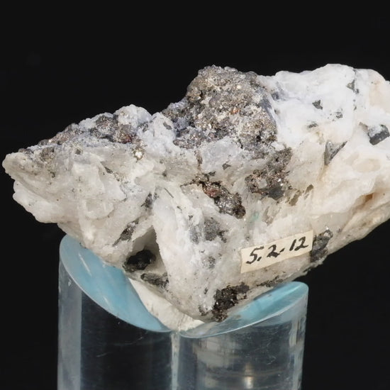 A prospector would have jumped for joy when coming across this spectacular silver ore sample from Oaxaca, Mexico. Wire silver is complemented by the less well-known “thorny” habit of Acanthite (after Argentite), along with one of the ruby silvers (Polybasite) in association with Stephanite ps after Argentite (as Acanthite at standard temperature and pressure). The calcite host rock fluoresces a hot reddish-pink. The light blue coloration observable in the UV photo is caused by minor residues of a former mounting material. Acquired from Bob’s Minerals late 80s – early 90s.